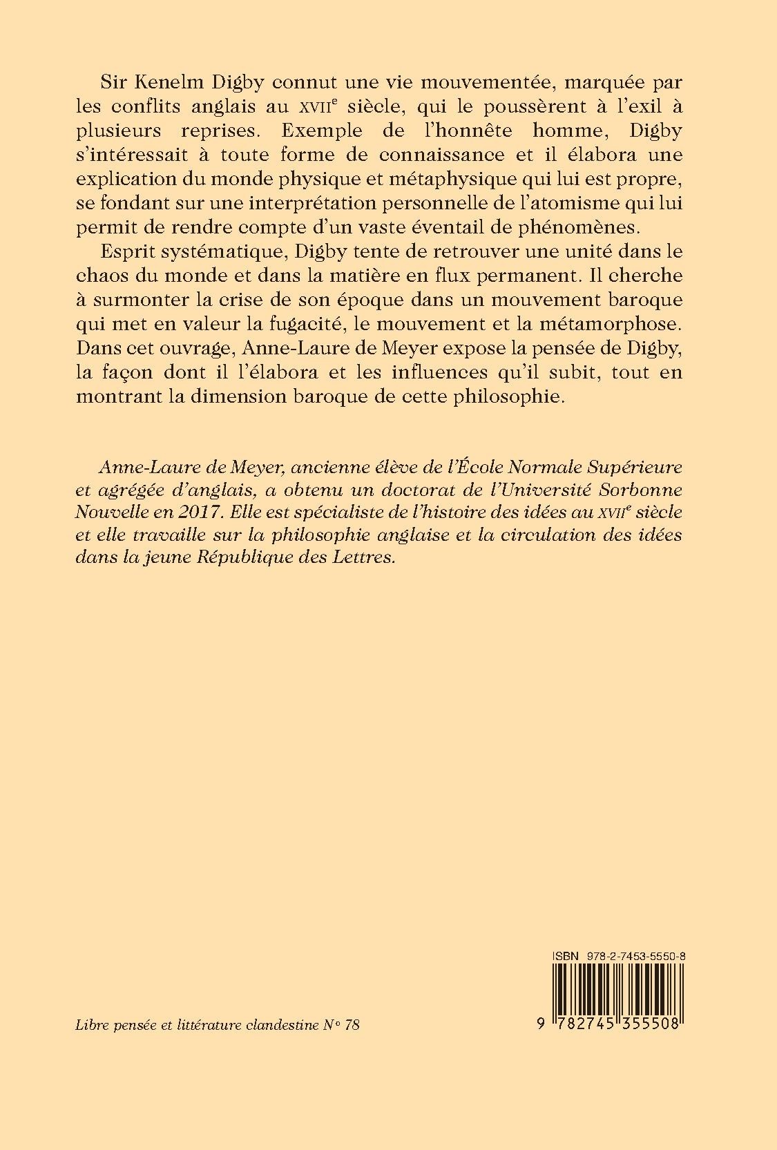 Esprit systématique, Digby tente de retrouver une unité dans le chaos du monde et dans la matière en flux permanent. Il cherche à surmonter la crise de son époque dans un mouvement baroque qui met en valeur la fugacité, le mouvement et la métamorphose. Dans cet ouvrage, Anne-Laure de Meyer expose la pensée de Digby, la façon dont il l’élabora et les influences qu’il subit, tout en montrant la dimension baroque de cette philosophie.