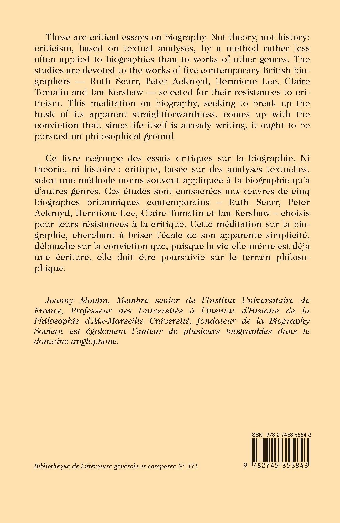 Ce livre regroupe des essais critiques sur la biographie. Ni théorie, ni histoire : critique, basée sur des analyses textuelles, selon une méthode moins souvent appliquée à la biographie qu’à d’autres genres. Ces études sont consacrées aux oeuvres de cinq biographes britanniques contemporains – Ruth Scurr, Peter Ackroyd, Hermione Lee, Claire Tomalin et Ian Kershaw – choisis pour leurs résistances à la critique. Cette méditation sur la biographie, cherchant à briser l’écale de son apparente simplicité, débouche sur la conviction que, puisque la vie elle-même est déjà une écriture, elle doit être poursuivie sur le terrain philosophique.