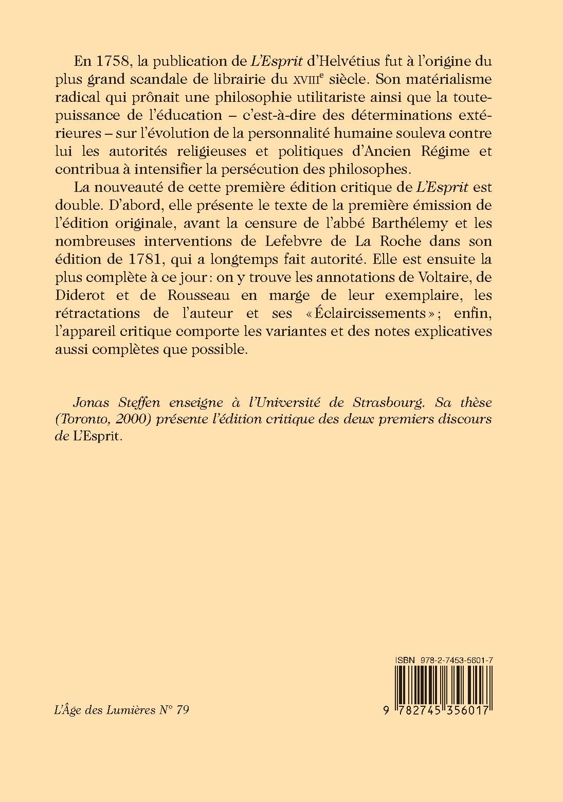 La nouveauté de cette première édition critique de L’Esprit est double. D’abord, elle présente le texte de la première émission de l’édition originale, avant la censure de l’abbé Barthélemy et les nombreuses interventions de Lefebvre de La Roche dans son édition de 1781, qui a longtemps fait autorité. Elle est ensuite la plus complète à ce jour: on y trouve les annotations de Voltaire, de Diderot et de Rousseau en marge de leur exemplaire, les rétractations de l’auteur et ses « Éclaircissements » ; enfin, l’appareil critique comporte les variantes et des notes explicatives aussi complètes que possible.