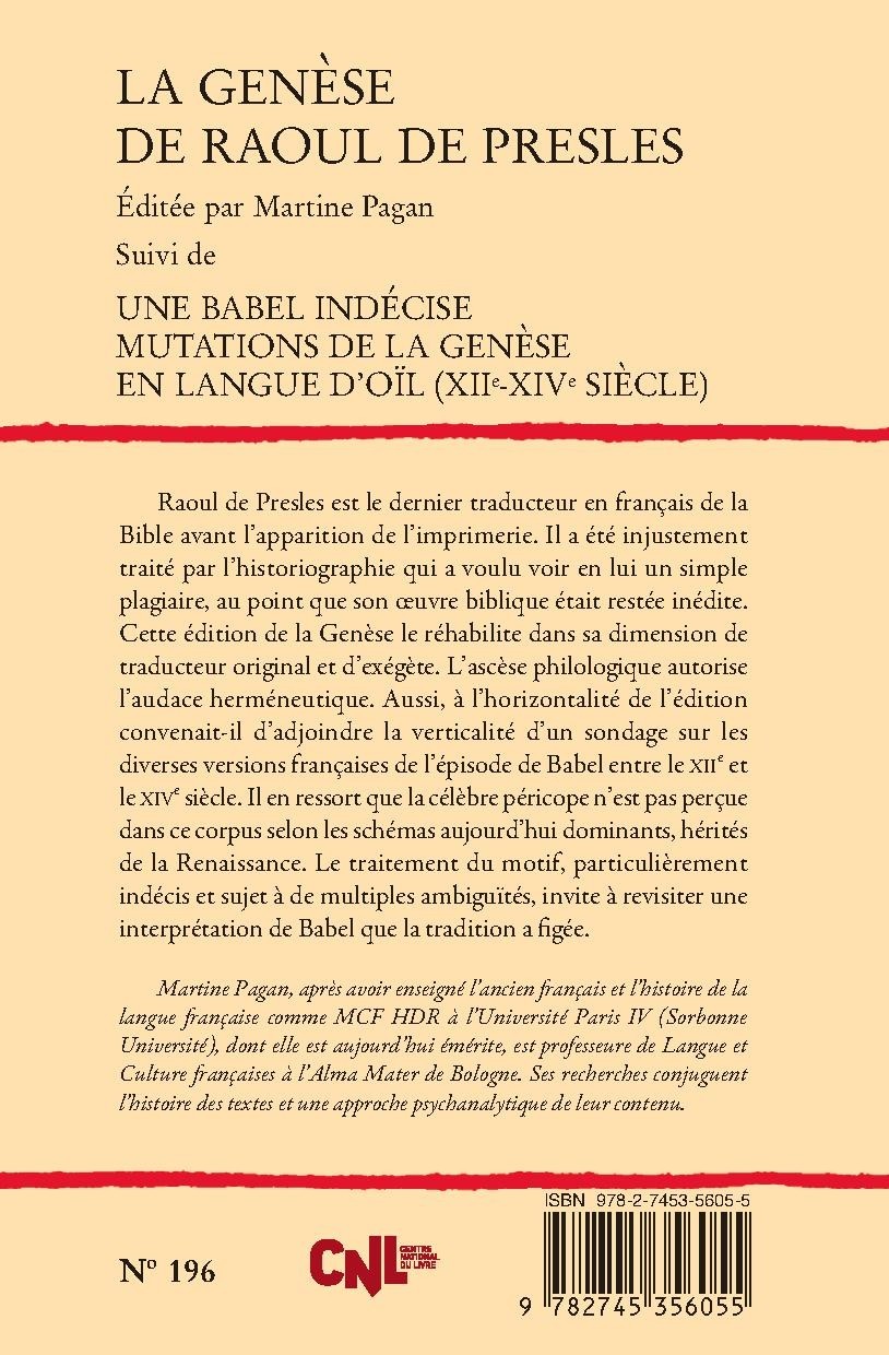 Raoul de Presles est le dernier traducteur en français de la Bible avant l’apparition de l’imprimerie. Il a été injustement traité par l’historiographie qui a voulu voir en lui un simple plagiaire, au point que son oeuvre biblique était restée inédite. Cette édition de la Genèse le réhabilite dans sa dimension de traducteur original et d’exégète. L’ascèse philologique autorise l’audace herméneutique. Aussi, à l’horizontalité de l’édition convenait-il d’adjoindre la verticalité d’un sondage sur les diverses versions françaises de l’épisode de Babel entre le XIIe et le XIVe siècle. Il en ressort que la célèbre péricope n’est pas perçue dans ce corpus selon les schémas aujourd’hui dominants, hérités de la Renaissance. Le traitement du motif, particulièrement indécis et sujet à de multiples ambiguïtés, invite à revisiter une interprétation de Babel que la tradition a figée.