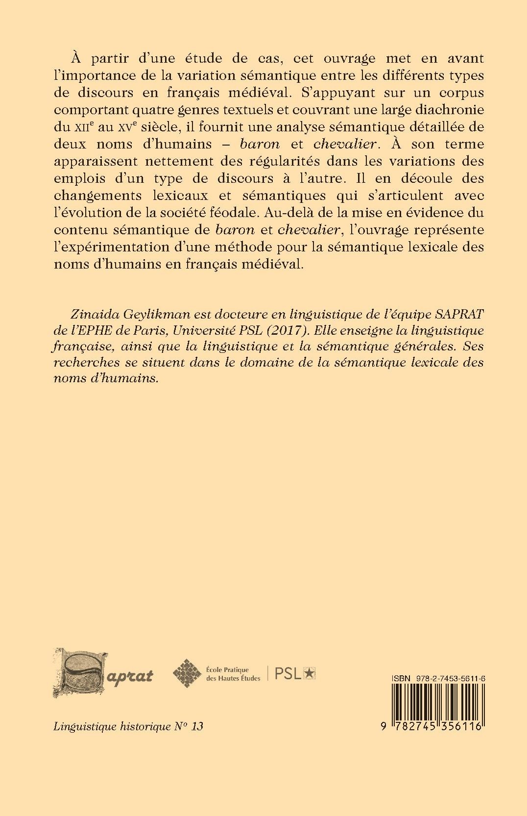 À partir d’une étude de cas, cet ouvrage met en avant l’importance de la variation sémantique entre les différents types de discours en français médiéval. S’appuyant sur un corpus comportant quatre genres textuels et couvrant une large diachronie du XIIe au XVe siècle, il fournit une analyse sémantique détaillée de deux noms d’humains – baron et chevalier. À son terme apparaissent nettement des régularités dans les variations des emplois d’un type de discours à l’autre. Il en découle des changements lexicaux et sémantiques qui s’articulent avec l’évolution de la société féodale. Au-delà de la mise en évidence du contenu sémantique de baron et chevalier, l’ouvrage représente l’expérimentation d’une méthode pour la sémantique lexicale des noms d’humains en français médiéval.