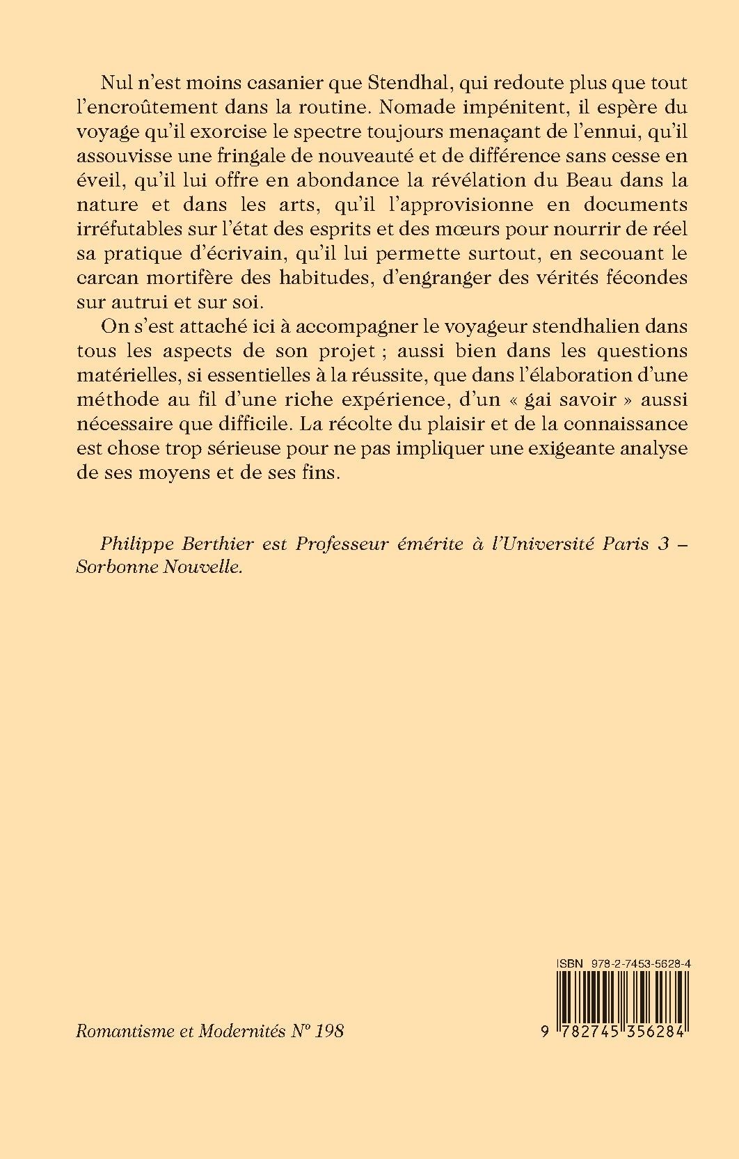 On s’est attaché ici à accompagner le voyageur stendhalien dans tous les aspects de son projet ; aussi bien dans les questions matérielles, si essentielles à la réussite, que dans l’élaboration d’une méthode au fil d’une riche expérience, d’un « gai savoir » aussi nécessaire que difficile. La récolte du plaisir et de la connaissance est chose trop sérieuse pour ne pas impliquer une exigeante analyse de ses moyens et de ses fins.