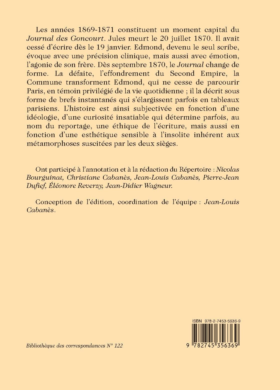 Les années 1869-1871 constituent un moment capital du Journal des Goncourt. Jules meurt le 20 juillet 1870. Il avait cessé d’écrire dès le 19 janvier. Edmond, devenu le seul scribe, évoque avec une précision clinique, mais aussi avec émotion, l’agonie de son frère. Dès septembre 1870, le Journal change de forme. La défaite, l’effondrement du Second Empire, la Commune transforment Edmond, qui ne cesse de parcourir Paris, en témoin privilégié de la vie quotidienne ; il la décrit sous forme de brefs instantanés qui s’élargissent parfois en tableaux parisiens. L’histoire est ainsi subjectivée en fonction d’une idéologie, d’une curiosité insatiable qui détermine parfois, au nom du reportage, une éthique de l’écriture, mais aussi en fonction d’une esthétique sensible à l’insolite inhérent aux métamorphoses suscitées par les deux sièges.