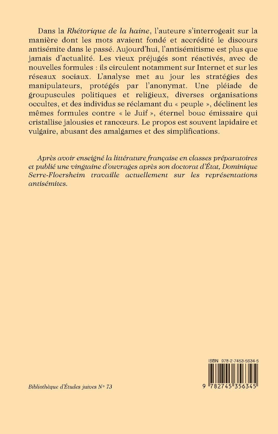 Dans la Rhétorique de la haine, l’auteure s’interrogeait sur la manière dont les mots avaient fondé et accrédité le discours antisémite dans le passé. Aujourd’hui, l’antisémitisme est plus que jamais d’actualité. Les vieux préjugés sont réactivés, avec de nouvelles formules : ils circulent notamment sur Internet et sur les réseaux sociaux. L’analyse met au jour les stratégies des manipulateurs, protégés par l’anonymat. Une pléiade de groupuscules politiques et religieux, diverses organisations occultes, et des individus se réclamant du « peuple », déclinent les mêmes formules contre « le Juif », éternel bouc émissaire qui cristallise jalousies et rancœurs. Le propos est souvent lapidaire et vulgaire, abusant des amalgames et des simplifications.