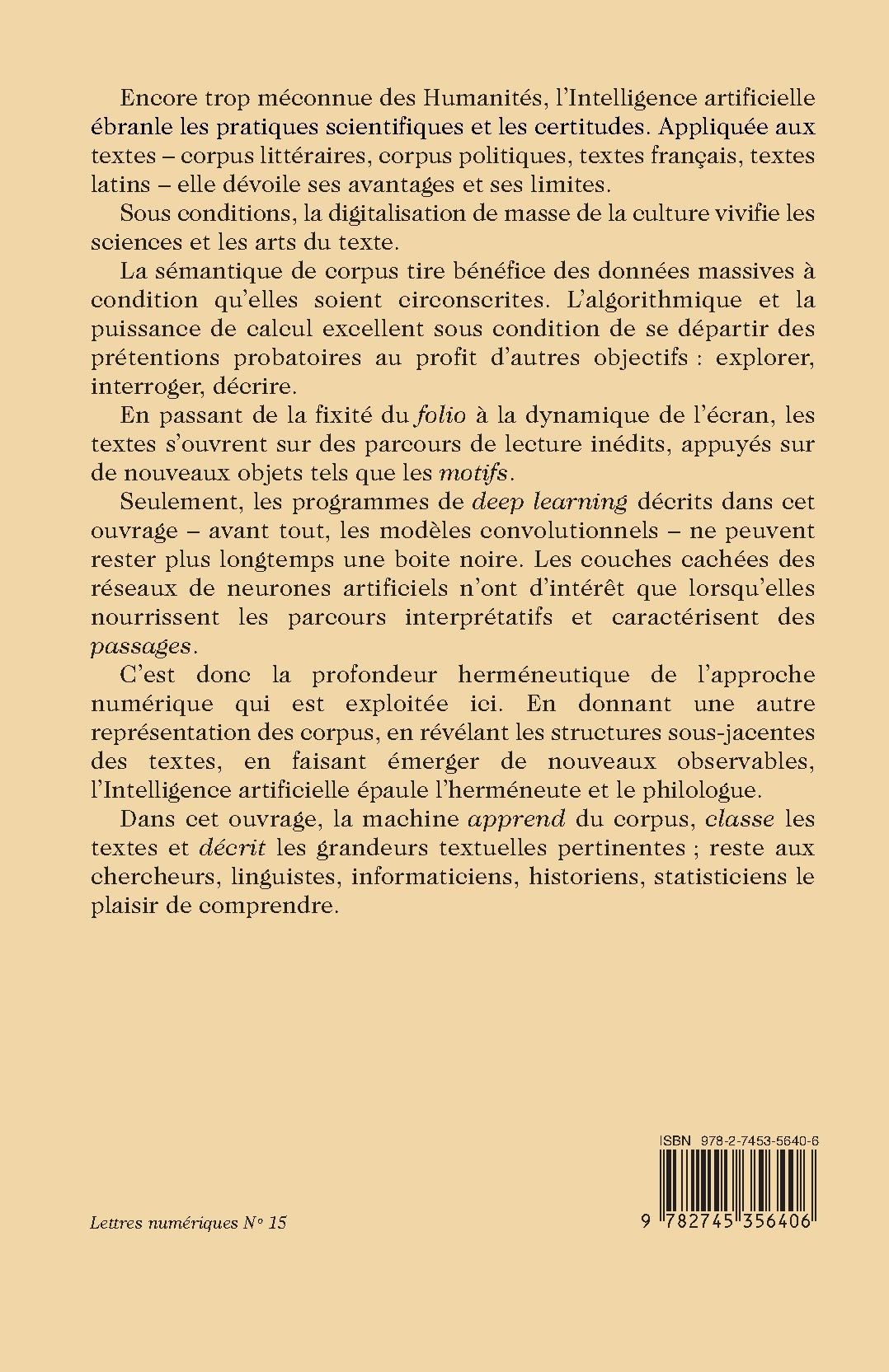 Dans cet ouvrage, la machine apprend du corpus, classe les textes et décrit les grandeurs textuelles pertinentes ; reste aux chercheurs, linguistes, informaticiens, historiens, statisticiens le plaisir de comprendre.