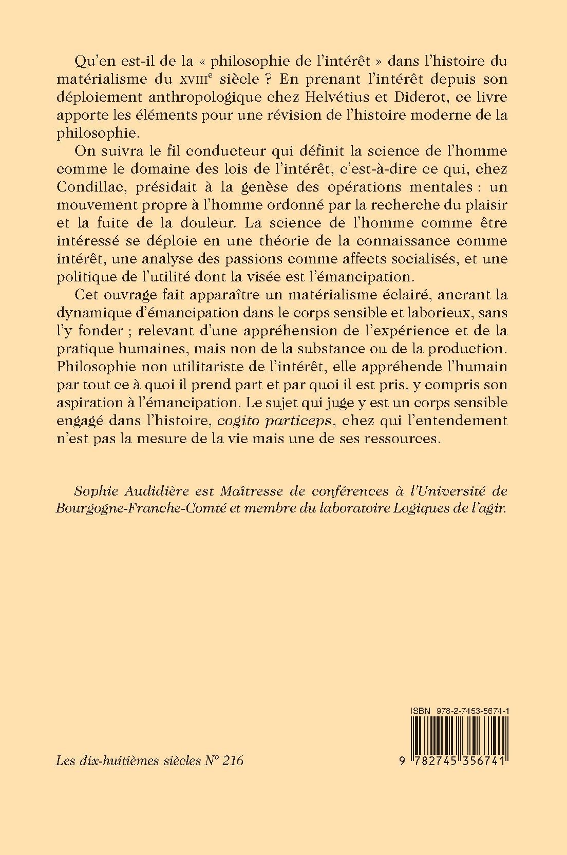 On suivra le fil conducteur qui définit la science de l’homme comme le domaine des lois de l’intérêt, c’est-à-dire ce qui, chez Condillac, présidait à la genèse des opérations mentales : un mouvement propre à l’homme ordonné par la recherche du plaisir et la fuite de la douleur. La science de l’homme comme être intéressé se déploie en une théorie de la connaissance comme intérêt, une analyse des passions comme affects socialisés, et une politique de l’utilité dont la visée est l’émancipation.