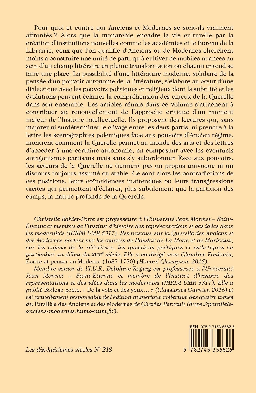 Pour quoi et contre qui Anciens et Modernes se sont-ils vraiment affrontés ? Alors que la monarchie encadre la vie culturelle par la création d’institutions nouvelles comme les académies et le Bureau de la Librairie, ceux que l’on qualifie d’Anciens ou de Modernes cherchent moins à construire une unité de parti qu’à cultiver de mobiles nuances au sein d’un champ littéraire en pleine transformation où chacun entend se faire une place. La possibilité d’une littérature moderne, solidaire de la pensée d’un pouvoir autonome de la littérature, s’élabore au cœur d’une dialectique avec les pouvoirs politiques et religieux dont la subtilité et les évolutions peuvent éclairer la compréhension des enjeux de la Querelle dans son ensemble. Les articles réunis dans ce volume s’attachent à contribuer au renouvellement de l’approche critique d’un moment majeur de l’histoire intellectuelle. Ils proposent des lectures qui, sans majorer ni surdéterminer le clivage entre les deux partis, ni prendre à la lettre les scénographies polémiques face aux pouvoirs d’Ancien régime, montrent comment la Querelle permet au monde des arts et des lettres d’accéder à une certaine autonomie, en composant avec les éventuels antagonismes partisans mais sans s’y subordonner. Face aux pouvoirs, les acteurs de la Querelle ne tiennent pas un propos univoque ni un discours toujours assumé ou stable. Ce sont alors les contradictions de ces positions, leurs coïncidences inattendues ou leurs transgressions tacites qui permettent d’éclairer, plus subtilement que la partition des camps, la nature profonde de la Querelle.