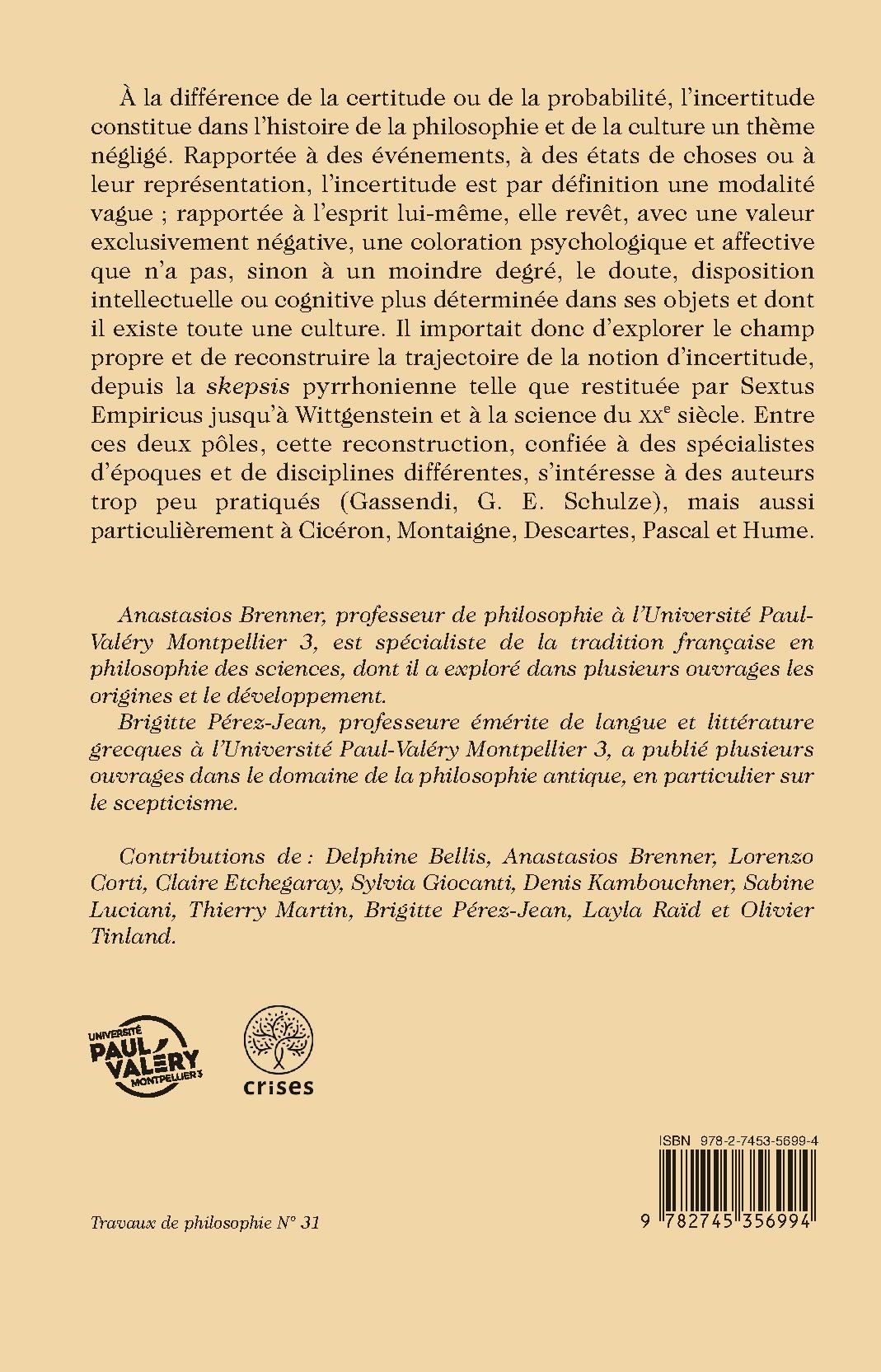 À la différence de la certitude ou de la probabilité, l’incertitude constitue dans l’histoire de la philosophie et de la culture un thème négligé. Rapportée à des événements, à des états de choses ou à leur représentation, l’incertitude est par définition une modalité vague ; rapportée à l’esprit lui-même, elle revêt, avec une valeur exclusivement négative, une coloration psychologique et affective que n’a pas, sinon à un moindre degré, le doute, disposition intellectuelle ou cognitive plus déterminée dans ses objets et dont il existe toute une culture. Il importait donc d’explorer le champ propre et de reconstruire la trajectoire de la notion d’incertitude, depuis la skepsis pyrrhonienne telle que restituée par Sextus Empiricus jusqu’à Wittgenstein et à la science du XXe siècle. Entre ces deux pôles, cette reconstruction, confiée à des spécialistes d’époques et de disciplines différentes, s’intéresse à des auteurs trop peu pratiqués (Gassendi, G. E. Schulze), mais aussi particulièrement à Cicéron, Montaigne, Descartes, Pascal et Hume.