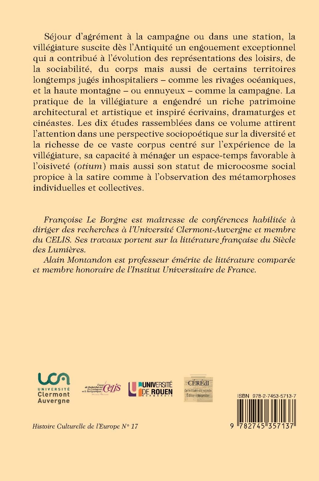 Séjour d’agrément à la campagne ou dans une station, la villégiature suscite dès l’Antiquité un engouement exceptionnel qui a contribué à l’évolution des représentations des loisirs, de la sociabilité, du corps mais aussi de certains territoires longtemps jugés inhospitaliers – comme les rivages océaniques, et la haute montagne – ou ennuyeux – comme la campagne. La pratique de la villégiature a engendré un riche patrimoine architectural et artistique et inspiré écrivains, dramaturges et cinéastes. Les dix études rassemblées dans ce volume attirent l’attention dans une perspective sociopoétique sur la diversité et la richesse de ce vaste corpus centré sur l’expérience de la villégiature, sa capacité à ménager un espace-temps favorable à l’oisiveté (otium) mais aussi son statut de microcosme social propice à la satire comme à l’observation des métamorphoses individuelles et collectives.