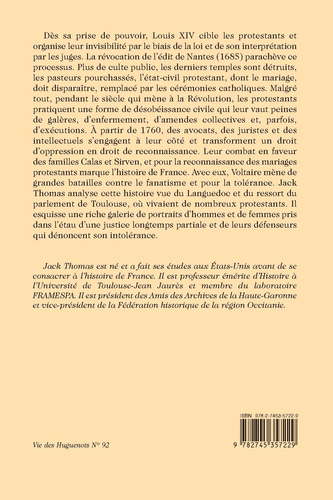 Dès sa prise de pouvoir, Louis XIV cible les protestants et organise leur invisibilité par le biais de la loi et de son interprétation par les juges. La révocation de l’édit de Nantes (1685) parachève ce processus. Plus de culte public, les derniers temples sont détruits, les pasteurs pourchassés, l’état-civil protestant, dont le mariage, doit disparaître, remplacé par les cérémonies catholiques. Malgré tout, pendant le siècle qui mène à la Révolution, les protestants pratiquent une forme de désobéissance civile qui leur vaut peines de galères, d’enfermement, d’amendes collectives et, parfois, d’exécutions. À partir de 1760, des avocats, des juristes et des intellectuels s’engagent à leur côté et transforment un droit d’oppression en droit de reconnaissance. Leur combat en faveur des familles Calas et Sirven, et pour la reconnaissance des mariages protestants marque l’histoire de France. Avec eux, Voltaire mène de grandes batailles contre le fanatisme et pour la tolérance. Jack Thomas analyse cette histoire vue du Languedoc et du ressort du parlement de Toulouse, où vivaient de nombreux protestants. Il esquisse une riche galerie de portraits d’hommes et de femmes pris dans l’étau d’une justice longtemps partiale et de leurs défenseurs qui dénoncent son intolérance.