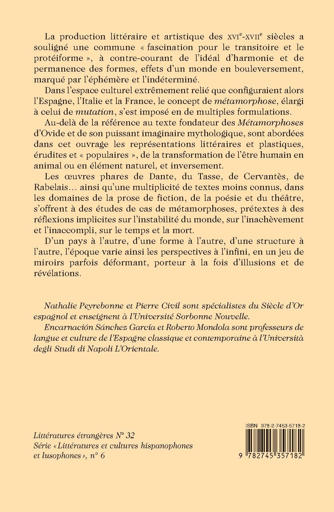 Les œuvres phares de Dante, du Tasse, de Cervantès, de Rabelais… ainsi qu’une multiplicité de textes moins connus, dans les domaines de la prose de fiction, de la poésie et du théâtre, s’offrent à des études de cas de métamorphoses, prétextes à des réflexions implicites sur l’instabilité du monde, sur l’inachèvement et l’inaccompli, sur le temps et la mort.
