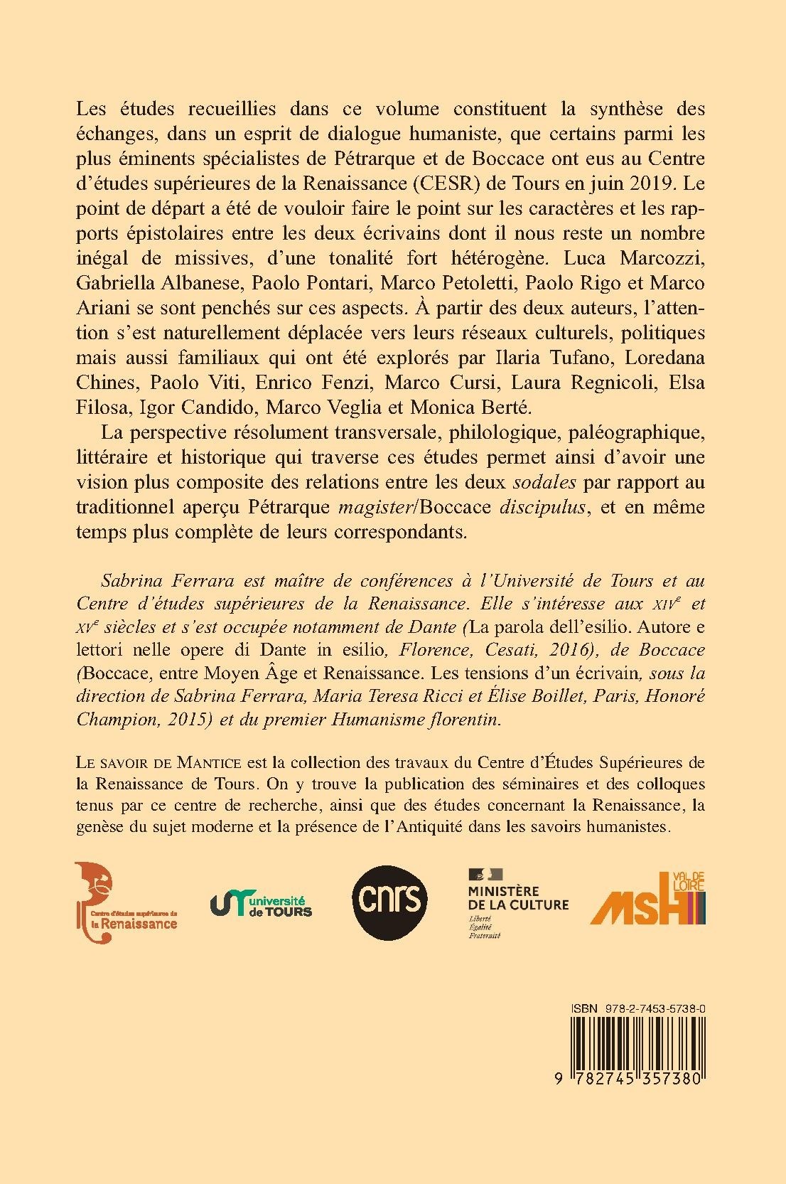 Les études recueillies dans ce volume constituent la synthèse des échanges, dans un esprit de dialogue humaniste, que certains parmi les plus éminents spécialistes de Pétrarque et de Boccace ont eus au Centre d’études supérieures de la Renaissance (CESR) de Tours en juin 2019. Le point de départ a été de vouloir faire le point sur les caractères et les rapports épistolaires entre les deux écrivains dont il nous reste un nombre inégal de missives, d’une tonalité fort hétérogène. Luca Marcozzi, Gabriella Albanese, Paolo Pontari, Marco Petoletti, Paolo Rigo et Marco Ariani se sont penchés sur ces aspects. À partir des deux auteurs, l’attention s’est naturellement déplacée vers leurs réseaux culturels, politiques mais aussi familiaux qui ont été explorés par Ilaria Tufano, Loredana Chines, Paolo Viti, Enrico Fenzi, Marco Cursi, Laura Regnicoli, Elsa Filosa, Igor Candido, Marco Veglia et Monica Berté.