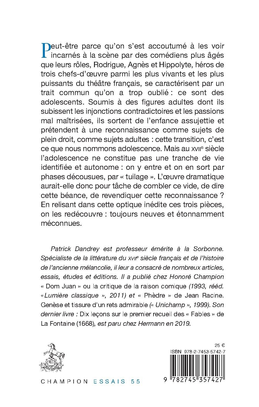 Peut-être parce qu’on s’est accoutumé à les voir incarnés à la scène par des comédiens plus âgés que leurs rôles, Rodrigue, Agnès et Hippolyte, héros de trois chefs-d’œuvre parmi les plus vivants et les plus puissants du théâtre français, se caractérisent par un trait commun qu’on a trop oublié : ce sont des adolescents. Soumis à des figures adultes dont ils subissent les injonctions contradictoires et les passions mal maîtrisées, ils sortent de l’enfance assujettie et prétendent à une reconnaissance comme sujets de plein droit, comme sujets adultes : cette transition, c’est ce que nous nommons adolescence. Mais au XVIIe siècle l’adolescence ne constitue pas une tranche de vie identifiée et autonome : on y entre et on en sort par phases décousues, par « tuilage ». L’œuvre dramatique aurait-elle donc pour tâche de combler ce vide, de dire cette béance, de revendiquer cette reconnaissance ? En relisant dans cette optique inédite ces trois pièces, on les redécouvre : toujours neuves et étonnamment méconnues.