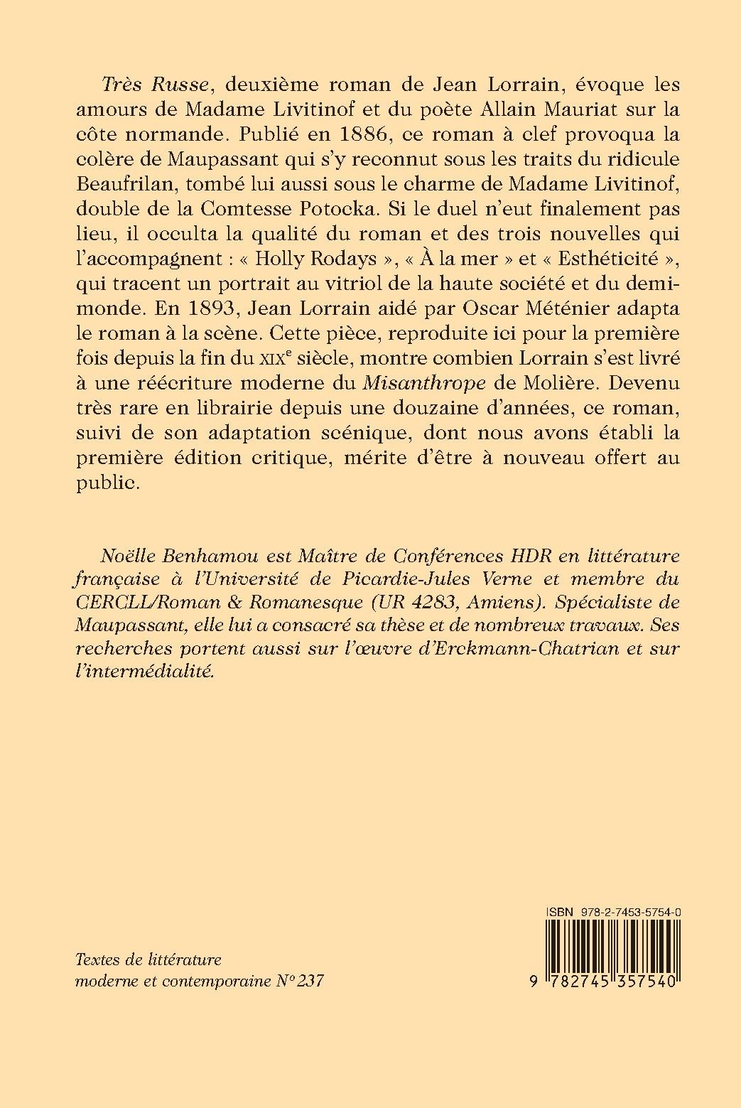 Très Russe, deuxième roman de Jean Lorrain, évoque les amours de Madame Livitinof et du poète Allain Mauriat sur la côte normande. Publié en 1886, ce roman à clef provoqua la colère de Maupassant qui s’y reconnut sous les traits du ridicule Beaufrilan, tombé lui aussi sous le charme de Madame Livitinof, double de la Comtesse Potocka. Si le duel n’eut finalement pas lieu, il occulta la qualité du roman et des trois nouvelles qui l’accompagnent : « Holly Rodays », « À la mer » et « Esthéticité », qui tracent un portrait au vitriol de la haute société et du demi-monde. En 1893, Jean Lorrain aidé par Oscar Méténier adapta le roman à la scène. Cette pièce, reproduite ici pour la première fois depuis la fin du XIXe siècle, montre combien Lorrain s’est livré à une réécriture moderne du Misanthrope de Molière. Devenu très rare en librairie depuis une douzaine d’années, ce roman, suivi de son adaptation scénique, dont nous avons établi la première édition critique, mérite d’être à nouveau offert au public.