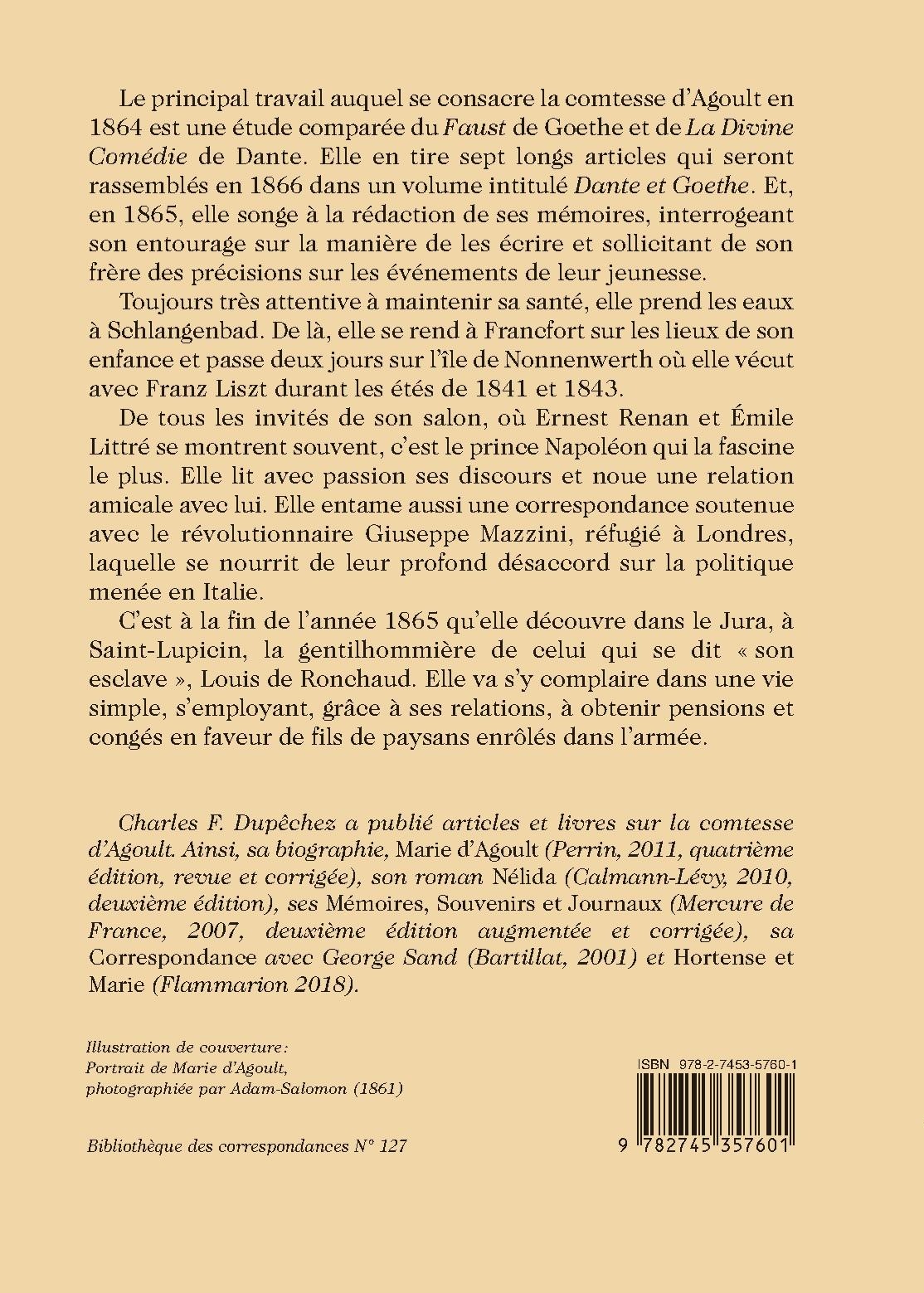 Le principal travail auquel se consacre la comtesse d’Agoult en 1864 est une étude comparée du Faust de Goethe et de La Divine Comédie de Dante. Elle en tire sept longs articles qui seront rassemblés en 1866 dans un volume intitulé Dante et Goethe. Et, en 1865, elle songe à la rédaction de ses mémoires, interrogeant son entourage sur la manière de les écrire et sollicitant de son frère des précisions sur les événements de leur jeunesse.