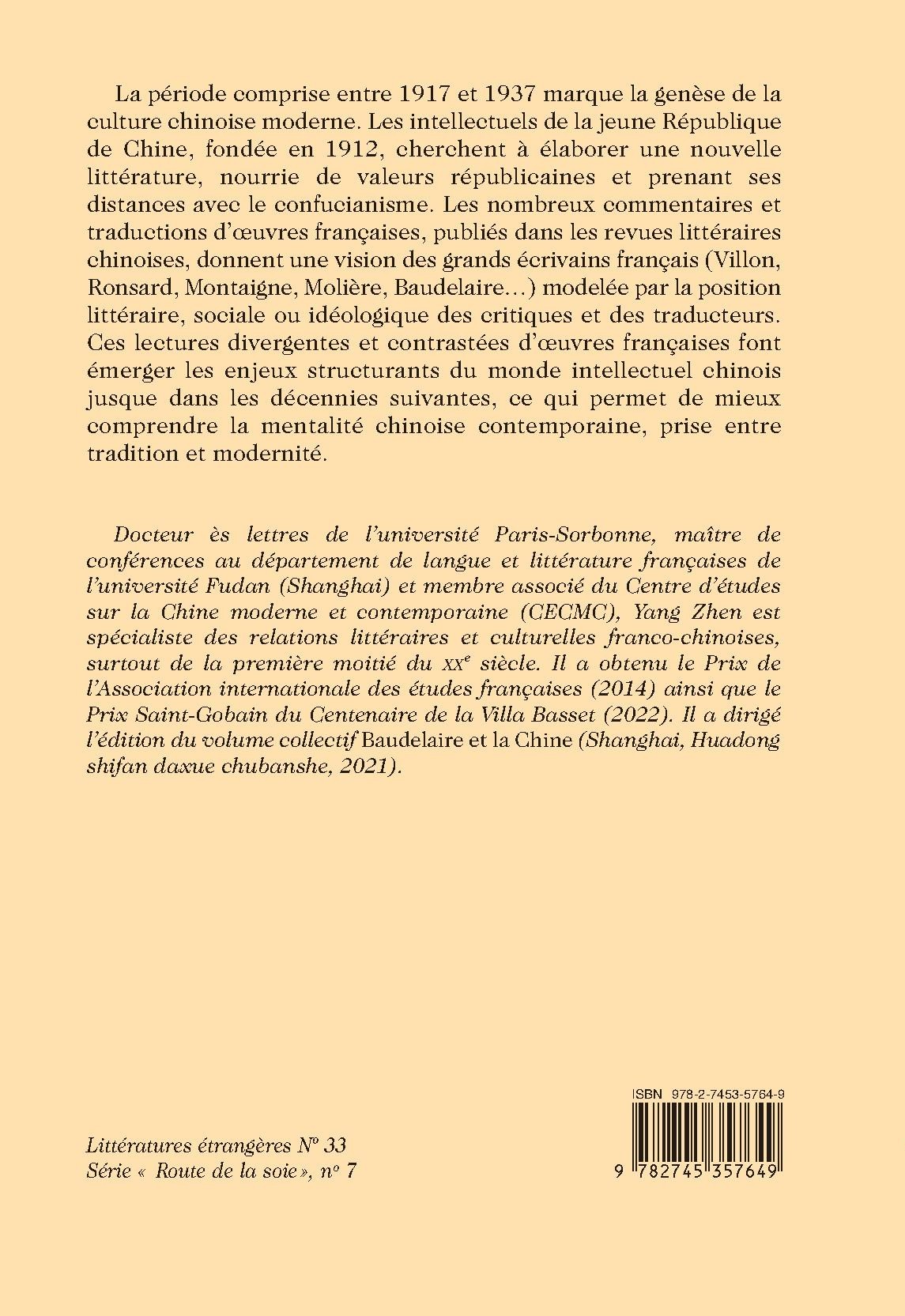 La période comprise entre 1917 et 1937 marque la genèse de la culture chinoise moderne. Les intellectuels de la jeune République de Chine, fondée en 1912, cherchent à élaborer une nouvelle littérature, nourrie de valeurs républicaines et prenant ses distances avec le confucianisme. Les nombreux commentaires et traductions d’œuvres françaises, publiés dans les revues littéraires chinoises, donnent une vision des grands écrivains français (Villon, Ronsard, Montaigne, Molière, Baudelaire…) modelée par la position littéraire, sociale ou idéologique des critiques et des traducteurs. Ces lectures divergentes et contrastées d’œuvres françaises font émerger les enjeux structurants du monde intellectuel chinois jusque dans les décennies suivantes, ce qui permet de mieux comprendre la mentalité chinoise contemporaine, prise entre tradition et modernité.