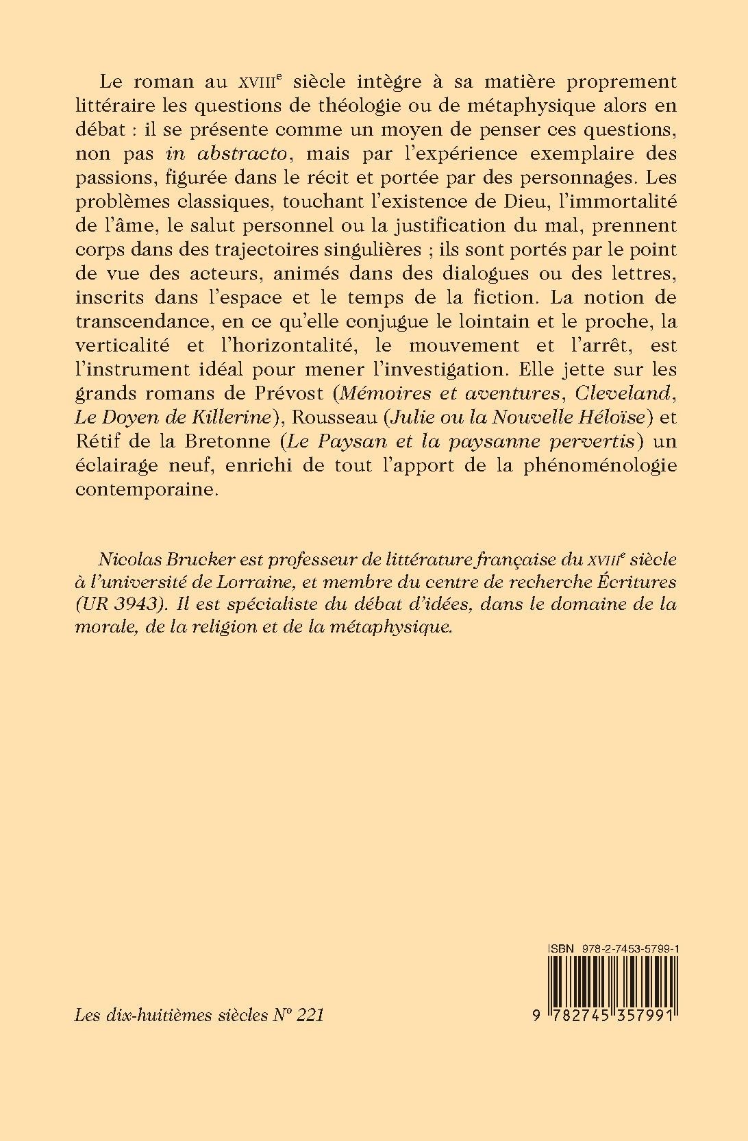 Le roman au XVIIIe siècle intègre à sa matière proprement littéraire les questions de théologie ou de métaphysique alors en débat : il se présente comme un moyen de penser ces questions, non pas in abstracto, mais par l’expérience exemplaire des passions, figurée dans le récit et portée par des personnages. Les problèmes classiques, touchant l’existence de Dieu, l’immortalité de l’âme, le salut personnel ou la justification du mal, prennent corps dans des trajectoires singulières ; ils sont portés par le point de vue des acteurs, animés dans des dialogues ou des lettres, inscrits dans l’espace et le temps de la fiction. La notion de transcendance, en ce qu’elle conjugue le lointain et le proche, la verticalité et l’horizontalité, le mouvement et l’arrêt, est l’instrument idéal pour mener l’investigation. Elle jette sur les grands romans de Prévost (Mémoires et aventures, Cleveland, Le Doyen de Killerine), Rousseau (Julie ou la Nouvelle Héloïse) et Rétif de la Bretonne (Le Paysan et la paysanne pervertis) un éclairage neuf, enrichi de tout l’apport de la phénoménologie contemporaine.
