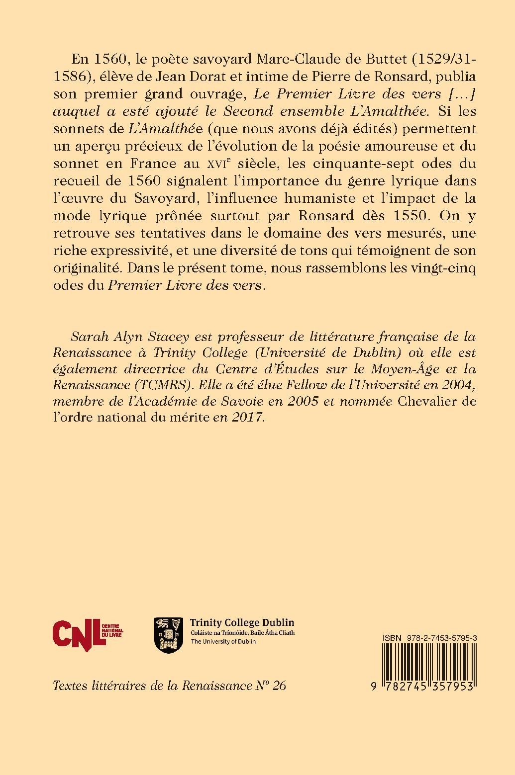En 1560, le poète savoyard Marc-Claude de Buttet (1529/31- 1586), élève de Jean Dorat et intime de Pierre de Ronsard, publia son premier grand ouvrage, Le Premier Livre des vers […] auquel a esté ajouté le Second ensemble L’Amalthée. Si les sonnets de L’Amalthée (que nous avons déjà édités) permettent un aperçu précieux de l’évolution de la poésie amoureuse et du sonnet en France au XVIe siècle, les cinquante-sept odes du recueil de 1560 signalent l’importance du genre lyrique dans l’œuvre du Savoyard, l’influence humaniste et l’impact de la mode lyrique prônée surtout par Ronsard dès 1550. On y retrouve ses tentatives dans le domaine des vers mesurés, une riche expressivité, et une diversité de tons qui témoignent de son originalité. Dans le présent tome, nous rassemblons les vingt-cinq odes du Premier Livre des vers.