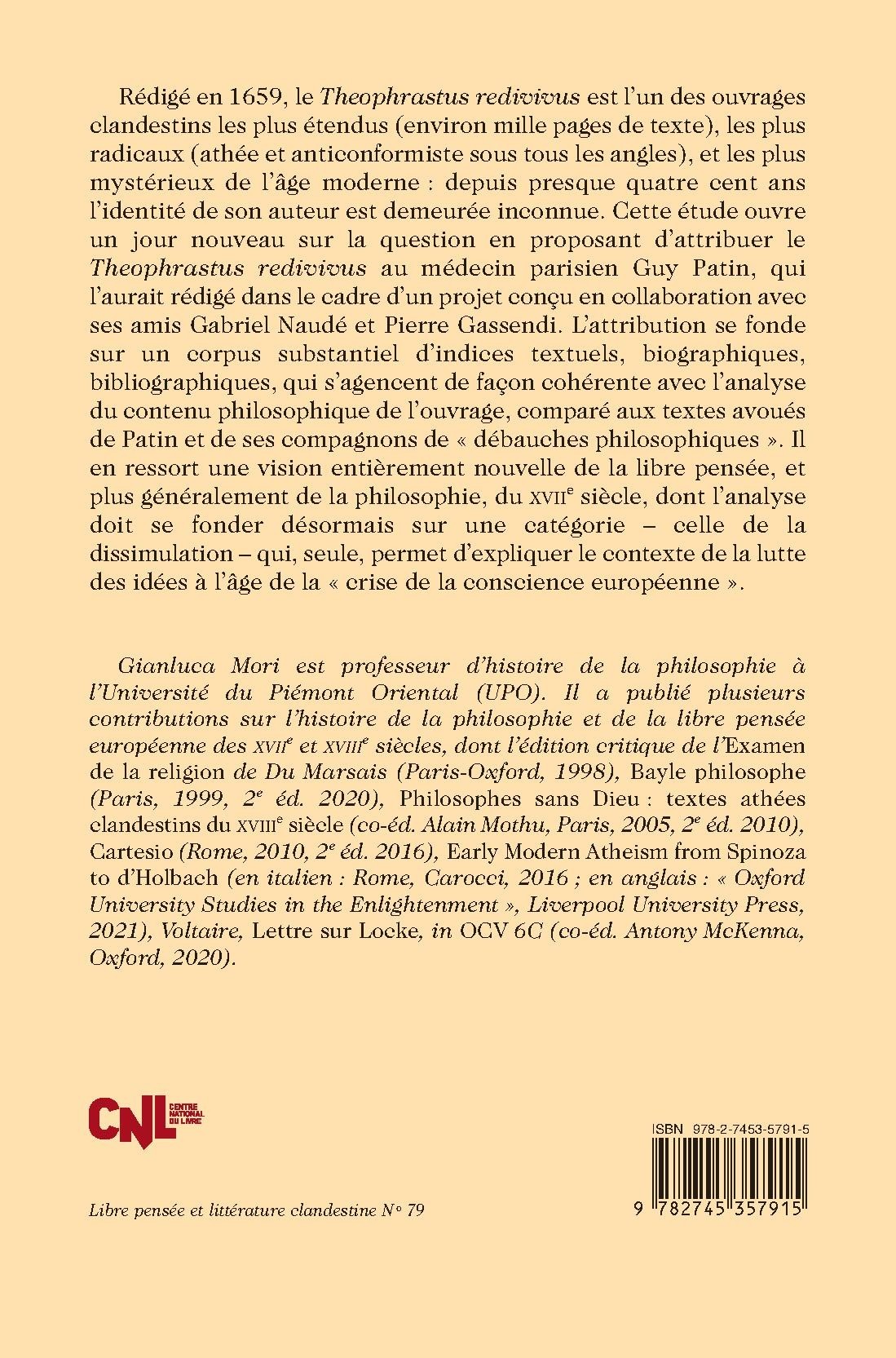 Rédigé en 1659, le Theophrastus redivivus est l’un des ouvrages clandestins les plus étendus (environ mille pages de texte), les plus radicaux (athée et anticonformiste sous tous les angles), et les plus mystérieux de l’âge moderne : depuis presque quatre cent ans l’identité de son auteur est demeurée inconnue. Cette étude ouvre un jour nouveau sur la question en proposant d’attribuer le Theophrastus redivivus au médecin parisien Guy Patin, qui l’aurait rédigé dans le cadre d’un projet conçu en collaboration avec ses amis Gabriel Naudé et Pierre Gassendi. L’attribution se fonde sur un corpus substantiel d’indices textuels, biographiques, bibliographiques, qui s’agencent de façon cohérente avec l’analyse du contenu philosophique de l’ouvrage, comparé aux textes avoués de Patin et de ses compagnons de « débauches philosophiques ». Il en ressort une vision entièrement nouvelle de la libre pensée, et plus généralement de la philosophie, du XVIIe siècle, dont l’analyse doit se fonder désormais sur une catégorie – celle de la dissimulation – qui, seule, permet d’expliquer le contexte de la lutte des idées à l’âge de la « crise de la conscience européenne »