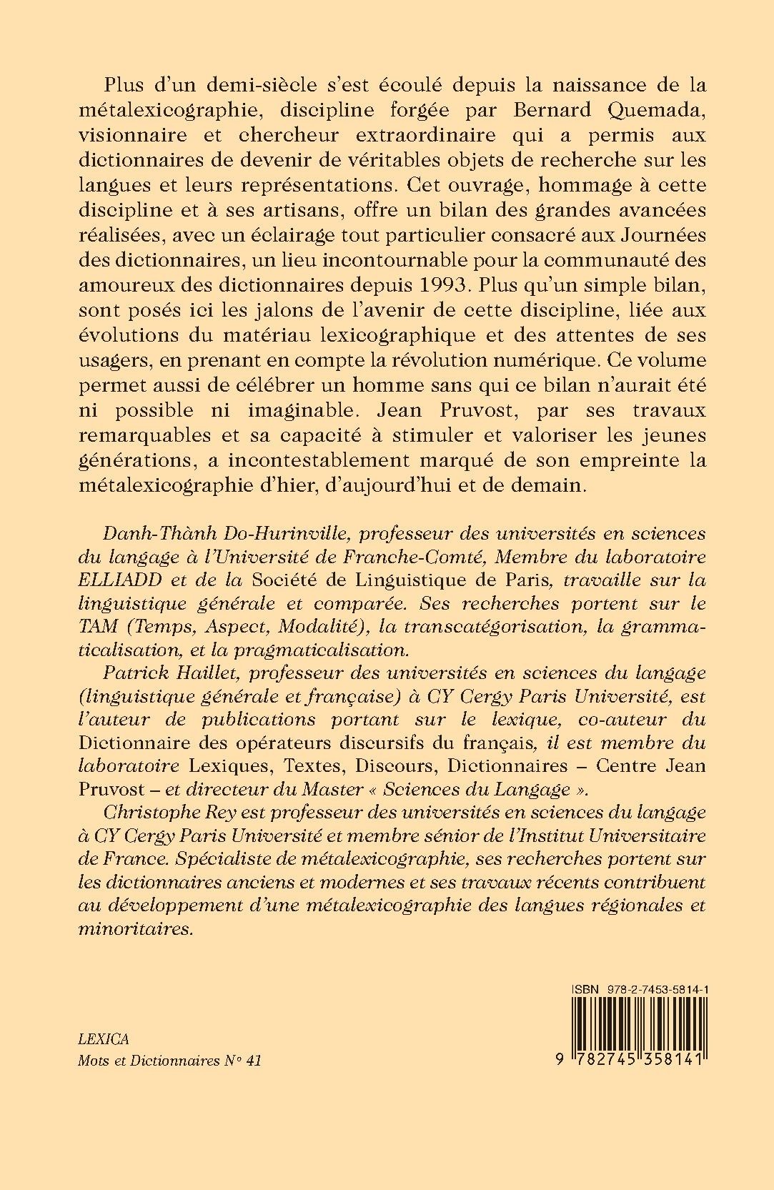 Plus d’un demi-siècle s’est écoulé depuis la naissance de la métalexicographie, discipline forgée par Bernard Quemada, visionnaire et chercheur extraordinaire qui a permis aux dictionnaires de devenir de véritables objets de recherche sur les langues et leurs représentations. Cet ouvrage, hommage à cette discipline et à ses artisans, offre un bilan des grandes avancées réalisées, avec un éclairage tout particulier consacré aux Journées des dictionnaires, un lieu incontournable pour la communauté des amoureux des dictionnaires depuis 1993. Plus qu’un simple bilan, sont posés ici les jalons de l’avenir de cette discipline, liée aux évolutions du matériau lexicographique et des attentes de ses usagers, en prenant en compte la révolution numérique. Ce volume permet aussi de célébrer un homme sans qui ce bilan n’aurait été ni possible ni imaginable. Jean Pruvost, par ses travaux remarquables et sa capacité à stimuler et valoriser les jeunes générations, a incontestablement marqué de son empreinte la métalexicographie d’hier, d’aujourd’hui et de demain.