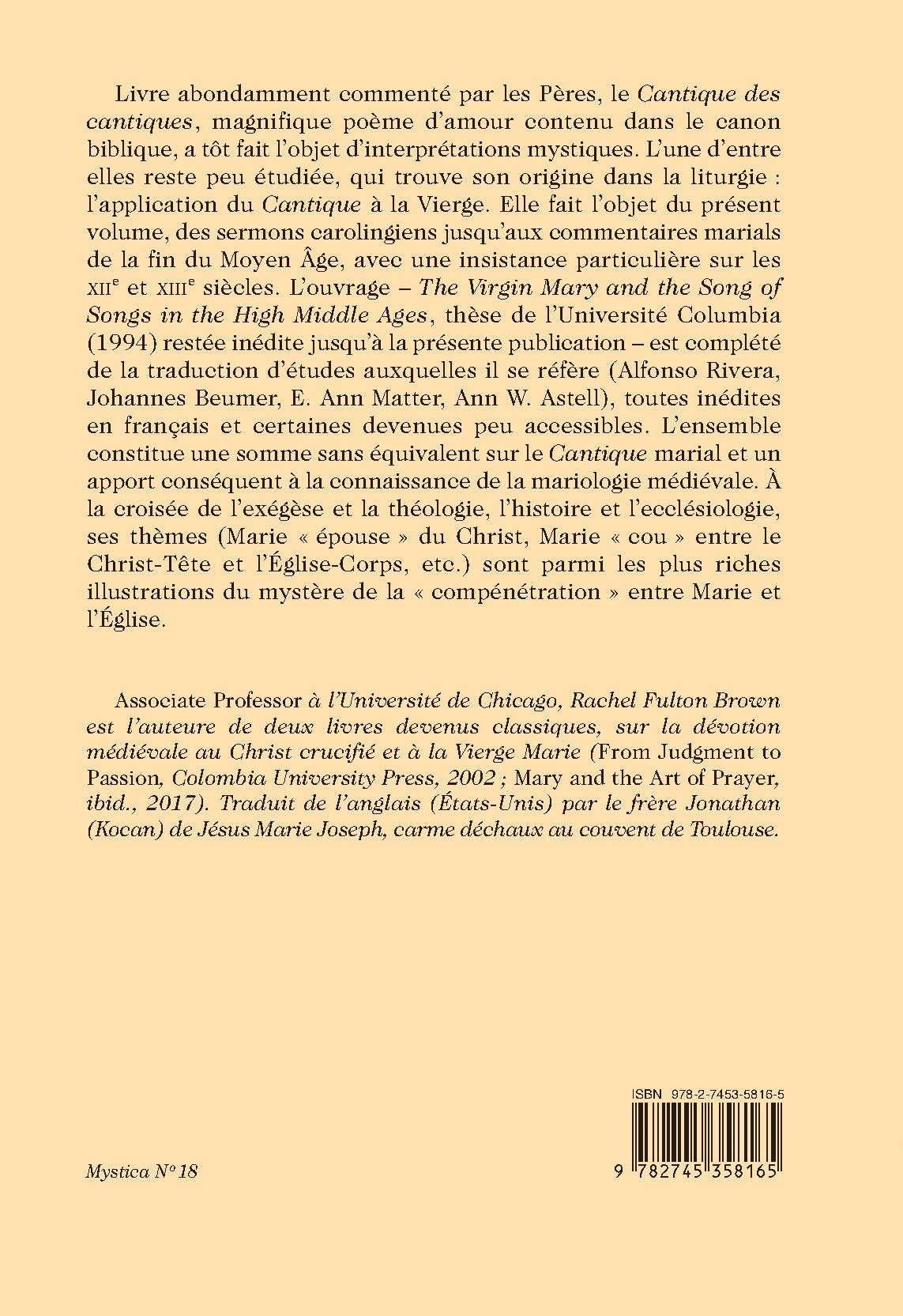 Livre abondamment commenté par les Pères, le Cantique des cantiques, magnifique poème d’amour contenu dans le canon biblique, a tôt fait l’objet d’interprétations mystiques. L’une d’entre elles reste peu étudiée, qui trouve son origine dans la liturgie : l’application du Cantique à la Vierge. Elle fait l’objet du présent volume, des sermons carolingiens jusqu’aux commentaires marials de la fin du Moyen Âge, avec une insistance particulière sur les XIIe et XIIIe siècles. L’ouvrage – The Virgin Mary and the Song of Songs in the High Middle Ages, thèse de l’Université Columbia (1994) restée inédite jusqu’à la présente publication – est complété de la traduction d’études auxquelles il se réfère (Alfonso Rivera, Johannes Beumer, E. Ann Matter, Ann W. Astell), toutes inédites en français et certaines devenues peu accessibles. L’ensemble constitue une somme sans équivalent sur le Cantique marial et un apport conséquent à la connaissance de la mariologie médiévale. À la croisée de l’exégèse et la théologie, l’histoire et l’ecclésiologie, ses thèmes (Marie « épouse » du Christ, Marie « cou » entre le Christ-Tête et l’Église-Corps, etc.) sont parmi les plus riches illustrations du mystère de la « compénétration » entre Marie et l’Église.