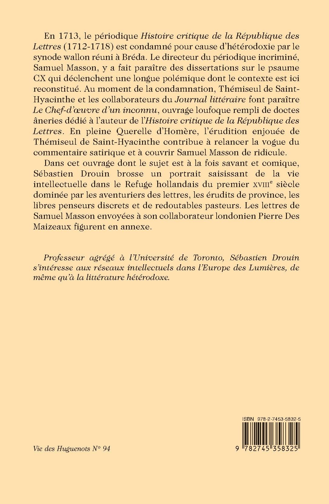 En 1713, le périodique Histoire critique de la République des Lettres (1712-1718) est condamné pour cause d’hétérodoxie par le synode wallon réuni à Bréda. Le directeur du périodique incriminé, Samuel Masson, y a fait paraître des dissertations sur le psaume CX qui déclenchent une longue polémique dont le contexte est ici reconstitué. Au moment de la condamnation, Thémiseul de Saint- Hyacinthe et les collaborateurs du Journal littéraire font paraître Le Chef-d’œuvre d’un inconnu, ouvrage loufoque rempli de doctes âneries dédié à l’auteur de l’Histoire critique de la République des Lettres. En pleine Querelle d’Homère, l’érudition enjouée de Thémiseul de Saint-Hyacinthe contribue à relancer la vogue du commentaire satirique et à couvrir Samuel Masson de ridicule.