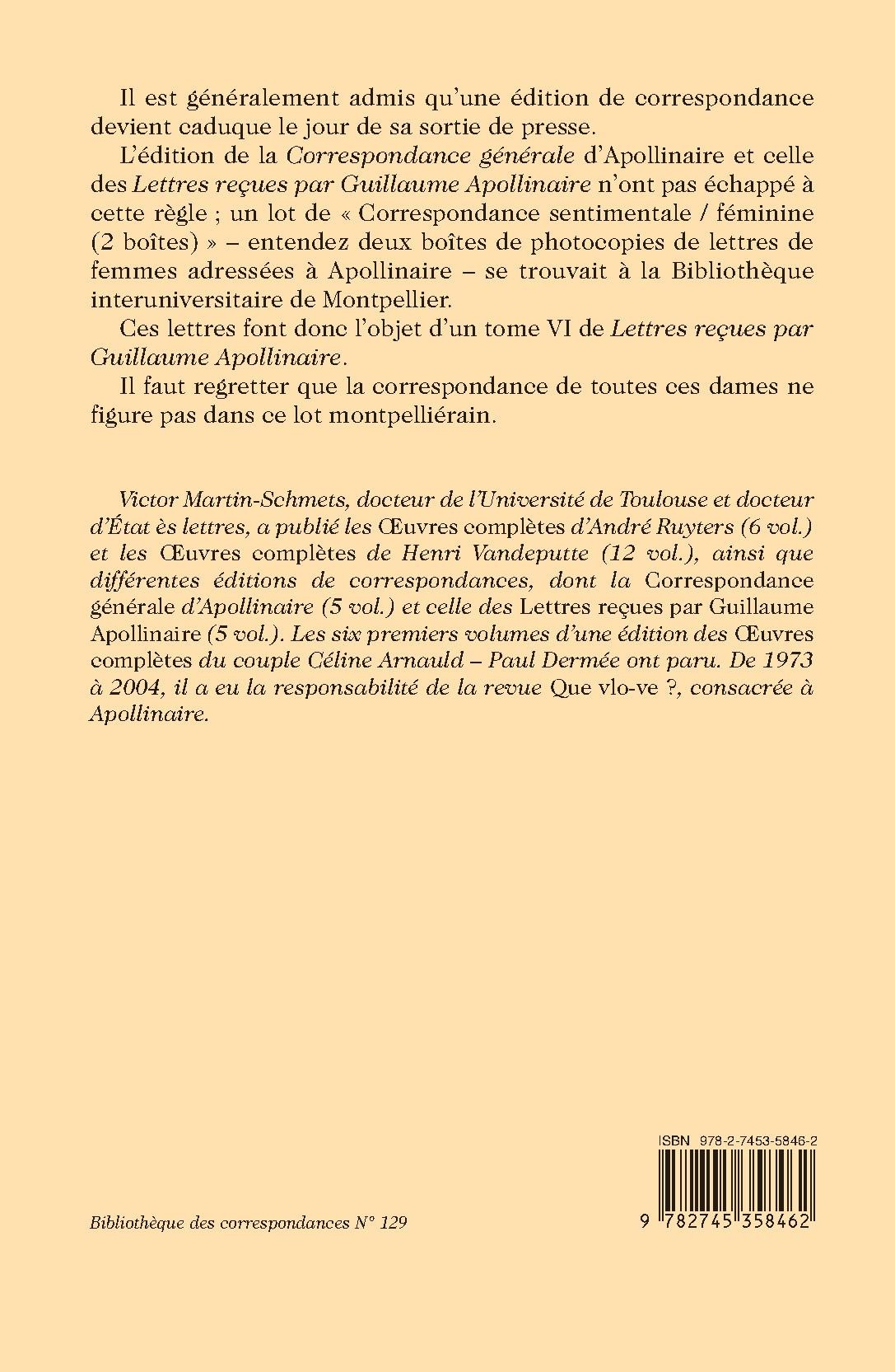 Il est généralement admis qu’une édition de correspondance devient caduque le jour de sa sortie de presse. L’édition de la Correspondance générale d’Apollinaire et celle des Lettres reçues par Guillaume Apollinaire n’ont pas échappé à cette règle ; un lot de « Correspondance sentimentale / féminine (2 boîtes) » – entendez deux boîtes de photocopies de lettres de femmes adressées à Apollinaire – se trouvait à la Bibliothèque interuniversitaire de Montpellier. Ces lettres font donc l’objet d’un tome VI de Lettres reçues par Guillaume Apollinaire. Il faut regretter que la correspondance de toutes ces dames ne figure pas dans ce lot montpelliérain.