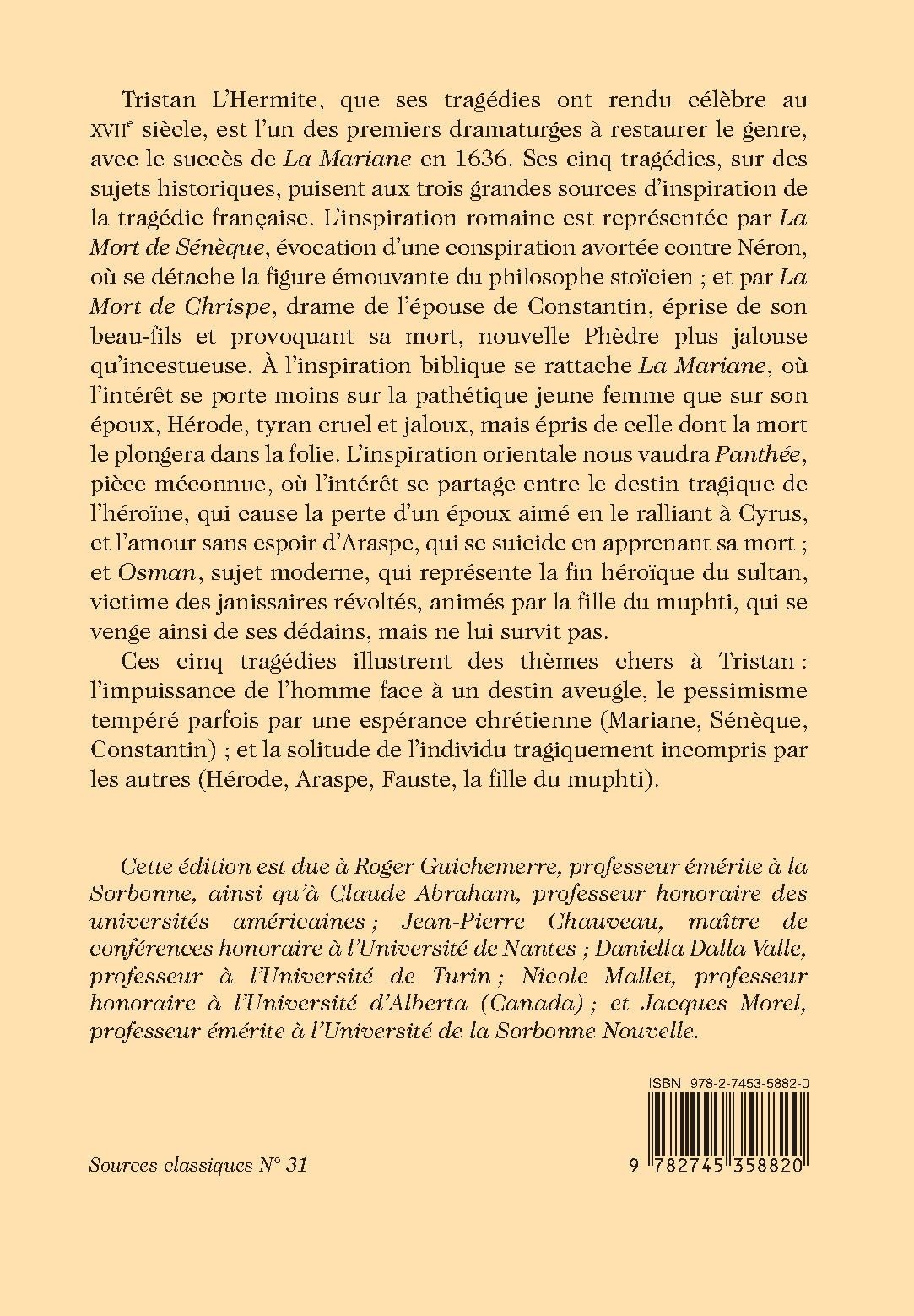 Tristan L’Hermite, que ses tragédies ont rendu célèbre au XVIIe siècle, est l’un des premiers dramaturges à restaurer le genre, avec le succès de La Mariane en 1636. Ses cinq tragédies, sur des sujets historiques, puisent aux trois grandes sources d’inspiration de la tragédie française. L’inspiration romaine est représentée par La Mort de Sénèque, évocation d’une conspiration avortée contre Néron, où se détache la figure émouvante du philosophe stoïcien ; et par La Mort de Chrispe, drame de l’épouse de Constantin, éprise de son beau-fils et provoquant sa mort, nouvelle Phèdre plus jalouse qu’incestueuse. À l’inspiration biblique se rattache La Mariane, où l’intérêt se porte moins sur la pathétique jeune femme que sur son époux, Hérode, tyran cruel et jaloux, mais épris de celle dont la mort le plongera dans la folie. L’inspiration orientale nous vaudra Panthée, pièce méconnue, où l’intérêt se partage entre le destin tragique de l’héroïne, qui cause la perte d’un époux aimé en le ralliant à Cyrus, et l’amour sans espoir d’Araspe, qui se suicide en apprenant sa mort ; et Osman, sujet moderne, qui représente la fin héroïque du sultan, victime des janissaires révoltés, animés par la fille du muphti, qui se venge ainsi de ses dédains, mais ne lui survit pas.