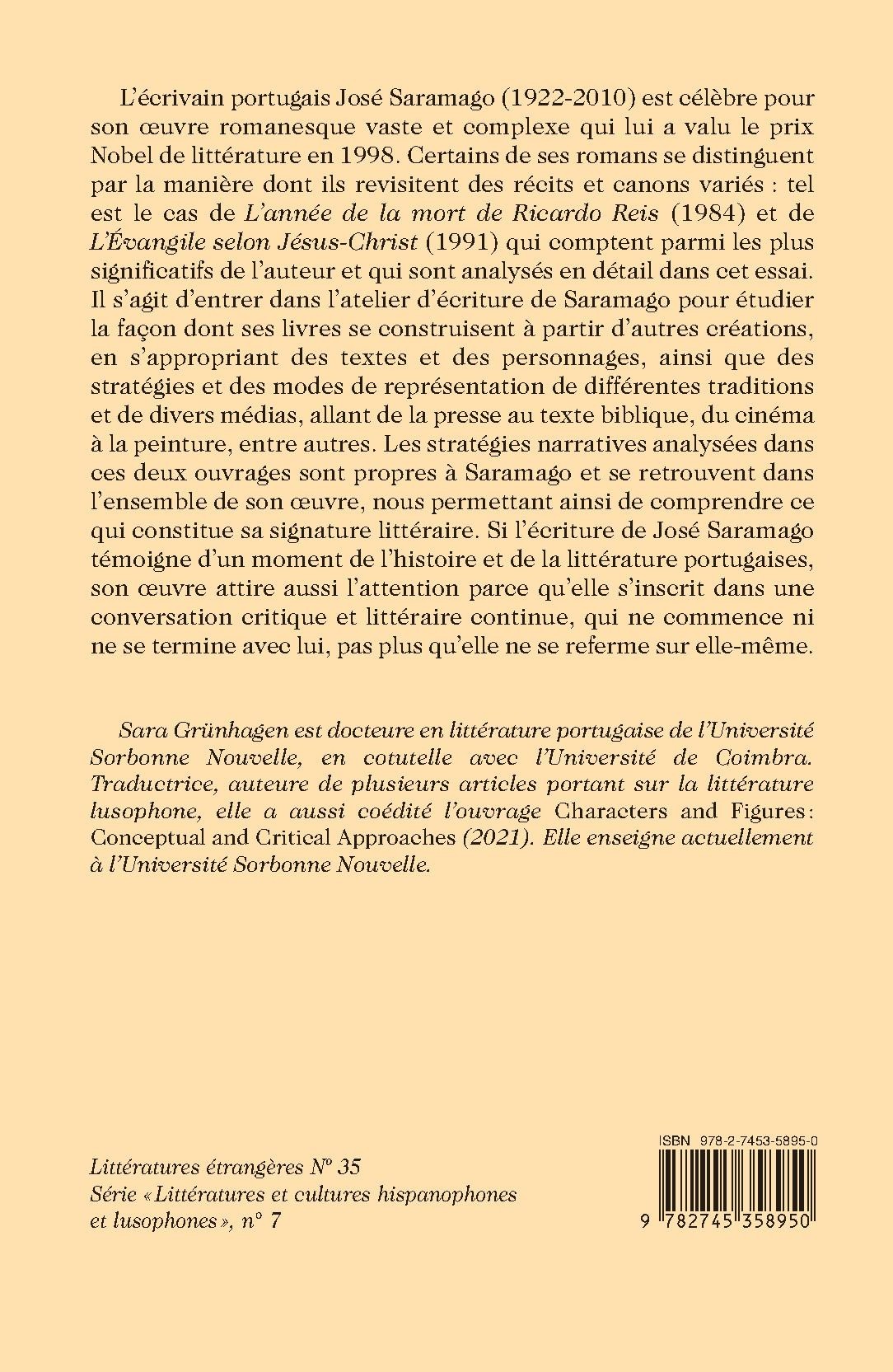 L’écrivain portugais José Saramago (1922-2010) est célèbre pour son œuvre romanesque vaste et complexe qui lui a valu le prix Nobel de littérature en 1998. Certains de ses romans se distinguent par la manière dont ils revisitent des récits et canons variés : tel est le cas de L’année de la mort de Ricardo Reis (1984) et de L’Évangile selon Jésus-Christ (1991) qui comptent parmi les plus significatifs de l’auteur et qui sont analysés en détail dans cet essai. Il s’agit d’entrer dans l’atelier d’écriture de Saramago pour étudier la façon dont ses livres se construisent à partir d’autres créations, en s’appropriant des textes et des personnages, ainsi que des stratégies et des modes de représentation de différentes traditions et de divers médias, allant de la presse au texte biblique, du cinéma à la peinture, entre autres. Les stratégies narratives analysées dans ces deux ouvrages sont propres à Saramago et se retrouvent dans l’ensemble de son œuvre, nous permettant ainsi de comprendre ce qui constitue sa signature littéraire. Si l’écriture de José Saramago témoigne d’un moment de l’histoire et de la littérature portugaises, son œuvre attire aussi l’attention parce qu’elle s’inscrit dans une conversation critique et littéraire continue, qui ne commence ni ne se termine avec lui, pas plus qu’elle ne se referme sur elle-même.
