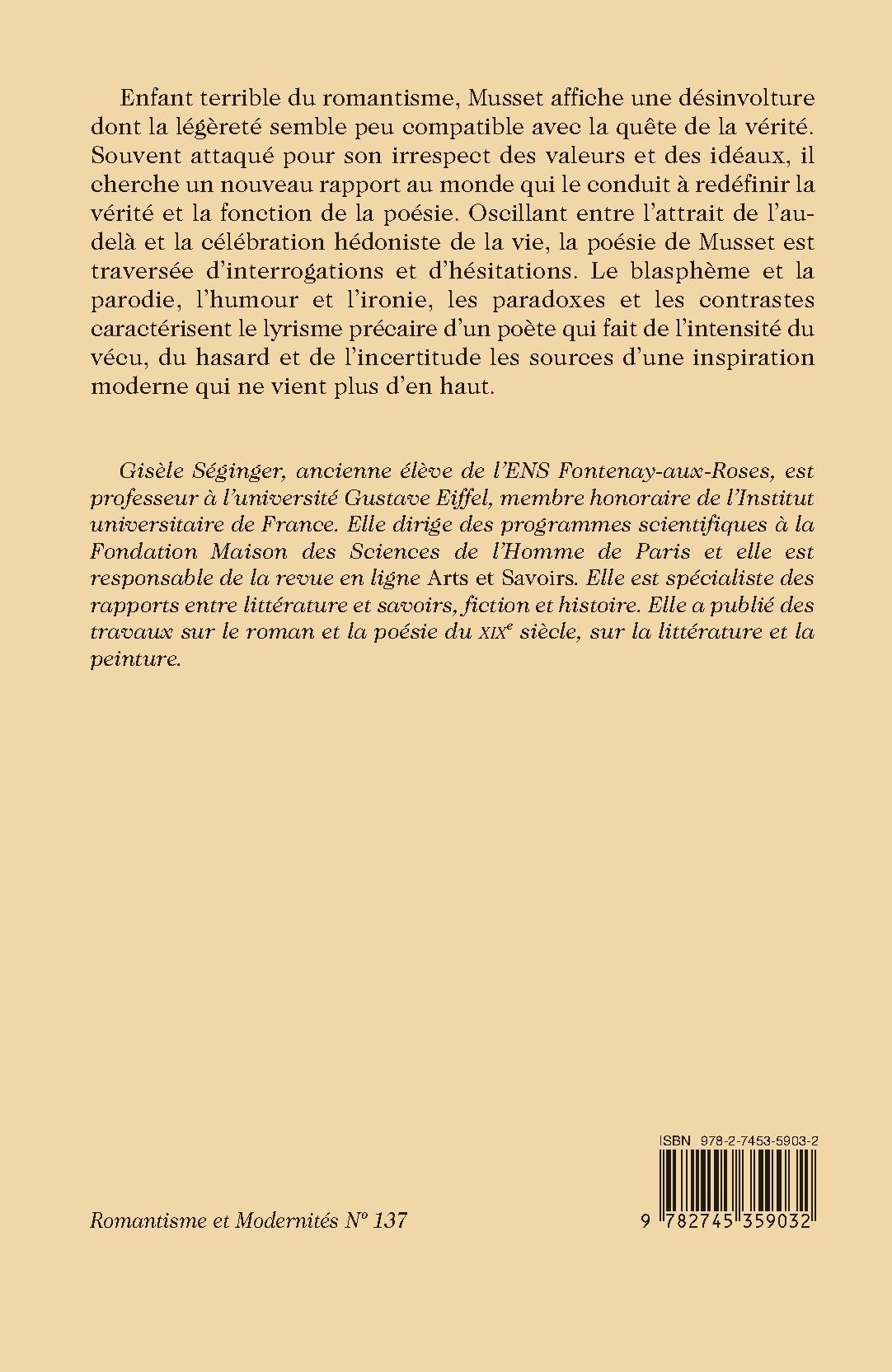 Enfant terrible du romantisme, Musset affiche une désinvolture dont la légèreté semble peu compatible avec la quête de la vérité. Souvent attaqué pour son irrespect des valeurs et des idéaux, il cherche un nouveau rapport au monde qui le conduit à redéfinir la vérité et la fonction de la poésie. Oscillant entre l’attrait de l’au-delà et la célébration hédoniste de la vie, la poésie de Musset est traversée d’interrogations et d’hésitations. Le blasphème et la parodie, l’humour et l’ironie, les paradoxes et les contrastes caractérisent le lyrisme précaire d’un poète qui fait de l’intensité du vécu, du hasard et de l’incertitude les sources d’une inspiration moderne qui ne vient plus d’en haut.