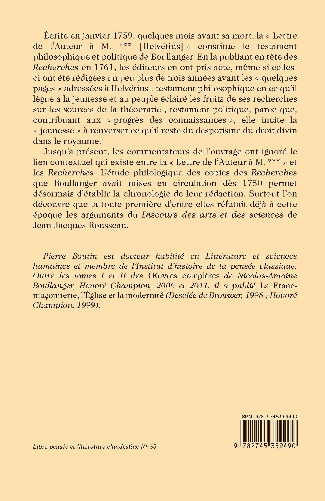 Écrite en janvier 1759, quelques mois avant sa mort, la « Lettre de l’Auteur à M. *** [Helvétius] » constitue le testament philosophique et politique de Boullanger. En la publiant en tête des Recherches en 1761, les éditeurs en ont pris acte, même si celles-ci ont été rédigées un peu plus de trois années avant les « quelques pages » adressées à Helvétius : testament philosophique en ce qu’il lègue à la jeunesse et au peuple éclairé les fruits de ses recherches sur les sources de la théocratie ; testament politique, parce que, contribuant aux « progrès des connaissances », elle incite la « jeunesse » à renverser ce qu’il reste du despotisme du droit divin dans le royaume.