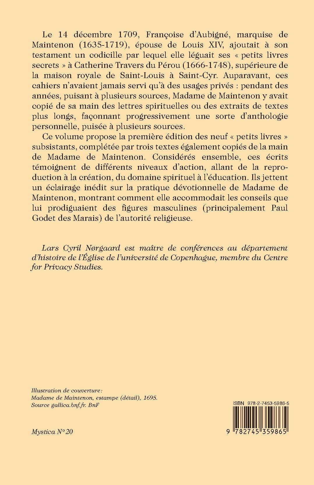 Le 14 décembre 1709, Françoise d’Aubigné, marquise de Maintenon (1635-1719), épouse de Louis XIV, ajoutait à son testament un codicille par lequel elle léguait ses « petits livres secrets » à Catherine Travers du Pérou (1666-1748), supérieure de la maison royale de Saint-Louis à Saint-Cyr. Auparavant, ces cahiers n’avaient jamais servi qu’à des usages privés : pendant des années, puisant à plusieurs sources, Madame de Maintenon y avait copié de sa main des lettres spirituelles ou des extraits de textes plus longs, façonnant progressivement une sorte d’anthologie personnelle, puisée à plusieurs sources.