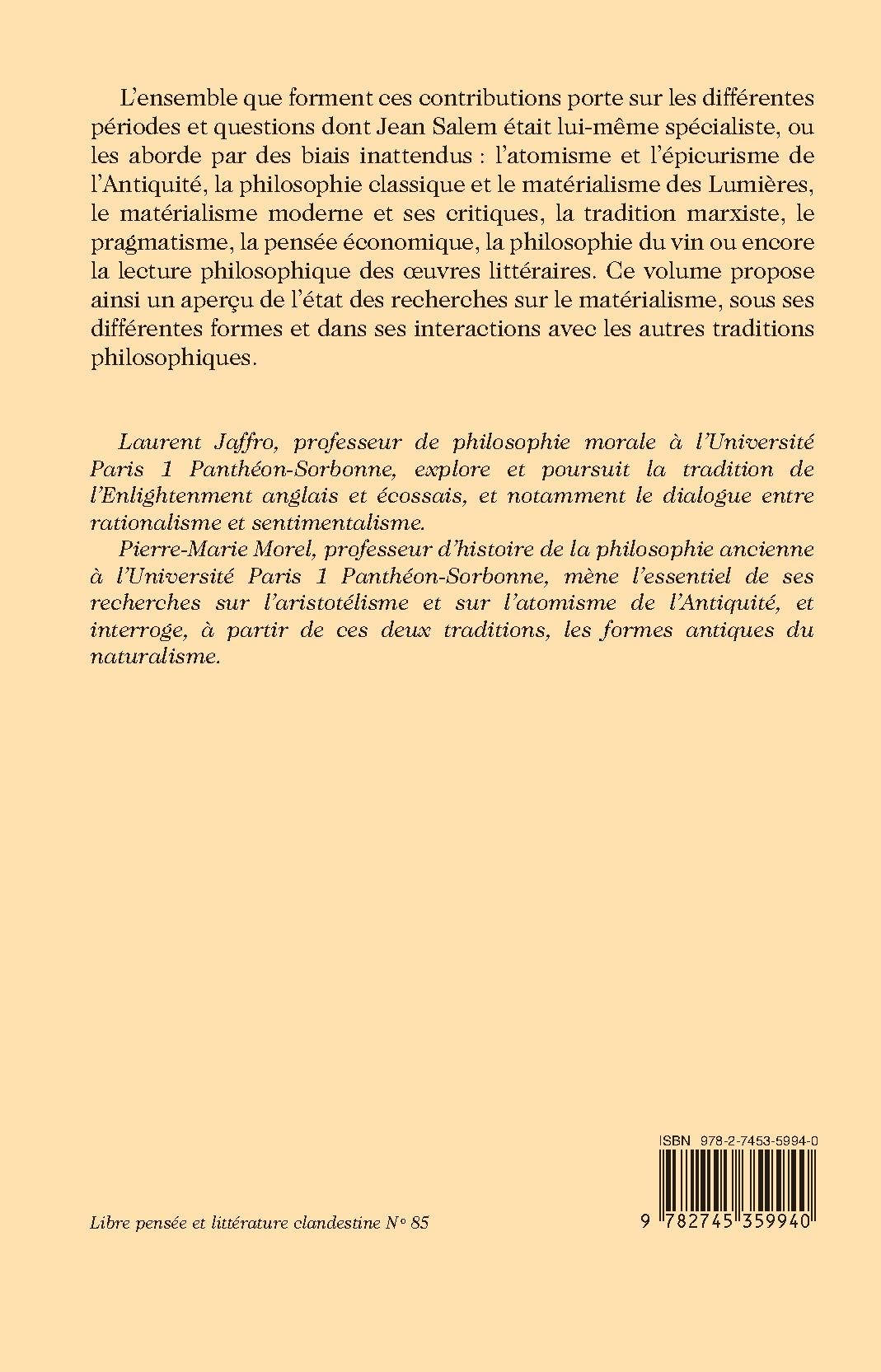 L’ensemble que forment ces contributions porte sur les différentes périodes et questions dont Jean Salem était lui-même spécialiste, ou les aborde par des biais inattendus : l’atomisme et l’épicurisme de l’Antiquité, la philosophie classique et le matérialisme des Lumières, le matérialisme moderne et ses critiques, la tradition marxiste, le pragmatisme, la pensée économique, la philosophie du vin ou encore la lecture philosophique des œuvres littéraires. Ce volume propose ainsi un aperçu de l’état des recherches sur le matérialisme, sous ses différentes formes et dans ses interactions avec les autres traditions philosophiques.