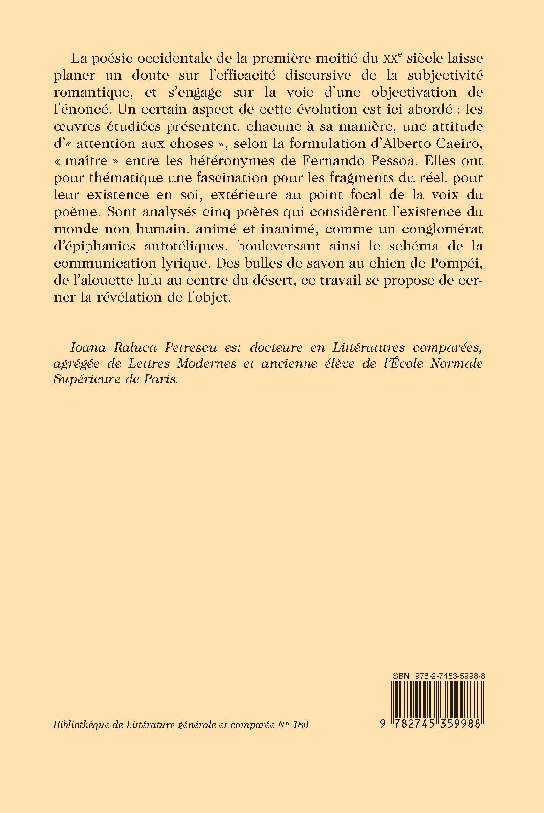 La poésie occidentale de la première moitié du XXe siècle laisse planer un doute sur l’efficacité discursive de la subjectivité romantique, et s’engage sur la voie d’une objectivation de l’énoncé. Un certain aspect de cette évolution est ici abordé : les œuvres étudiées présentent, chacune à sa manière, une attitude d’« attention aux choses », selon la formulation d’Alberto Caeiro, « maître » entre les hétéronymes de Fernando Pessoa. Elles ont pour thématique une fascination pour les fragments du réel, pour leur existence en soi, extérieure au point focal de la voix du poème. Sont analysés cinq poètes qui considèrent l’existence du monde non humain, animé et inanimé, comme un conglomérat d’épiphanies autotéliques, bouleversant ainsi le schéma de la communication lyrique. Des bulles de savon au chien de Pompéi, de l’alouette lulu au centre du désert, ce travail se propose de cerner la révélation de l’objet.