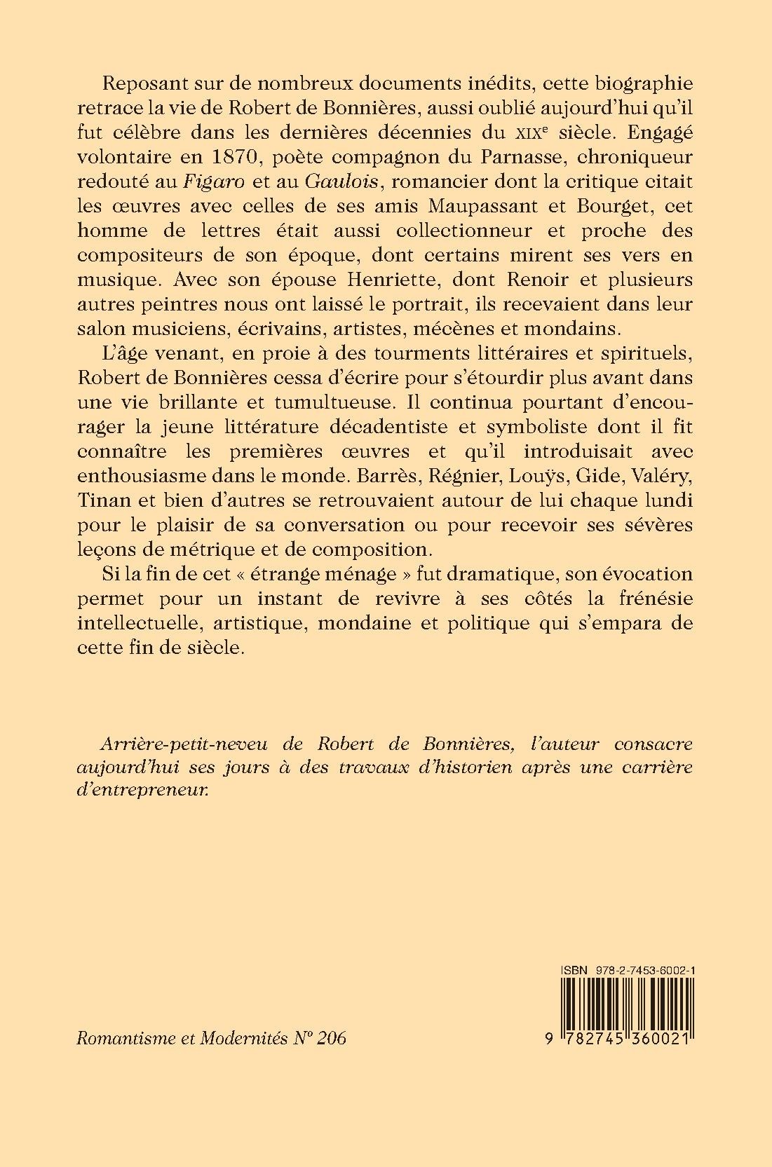 Reposant sur de nombreux documents inédits, cette biographie retrace la vie de Robert de Bonnières, aussi oublié aujourd’hui qu’il fut célèbre dans les dernières décennies du XIXe siècle. Engagé volontaire en 1870, poète compagnon du Parnasse, chroniqueur redouté au Figaro et au Gaulois, romancier dont la critique citait les œuvres avec celles de ses amis Maupassant et Bourget, cet homme de lettres était aussi collectionneur et proche des compositeurs de son époque, dont certains mirent ses vers en musique. Avec son épouse Henriette, dont Renoir et plusieurs autres peintres nous ont laissé le portrait, ils recevaient dans leur salon musiciens, écrivains, artistes, mécènes et mondains.