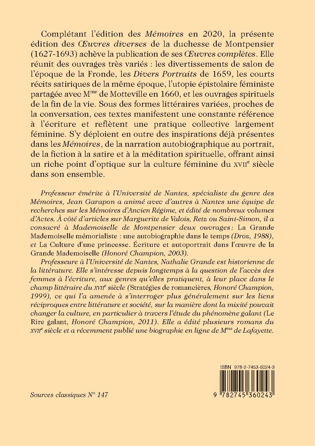 Complétant l’édition des Mémoires en 2020, la présente édition des Œuvres diverses de la duchesse de Montpensier (1627-1693) achève la publication de ses Œuvres complètes. Elle réunit des ouvrages très variés : les divertissements de salon de l’époque de la Fronde, les Divers Portraits de 1659, les courts récits satiriques de la même époque, l’utopie épistolaire féministe partagée avec Mme de Motteville en 1660, et les ouvrages spirituels de la fin de la vie. Sous des formes littéraires variées, proches de la conversation, ces textes manifestent une constante référence à l’écriture et reflètent une pratique collective largement féminine. S’y déploient en outre des inspirations déjà présentes dans les Mémoires, de la narration autobiographique au portrait, de la fiction à la satire et à la méditation spirituelle, offrant ainsi un riche point d’optique sur la culture féminine du XVIIe siècle dans son ensemble.