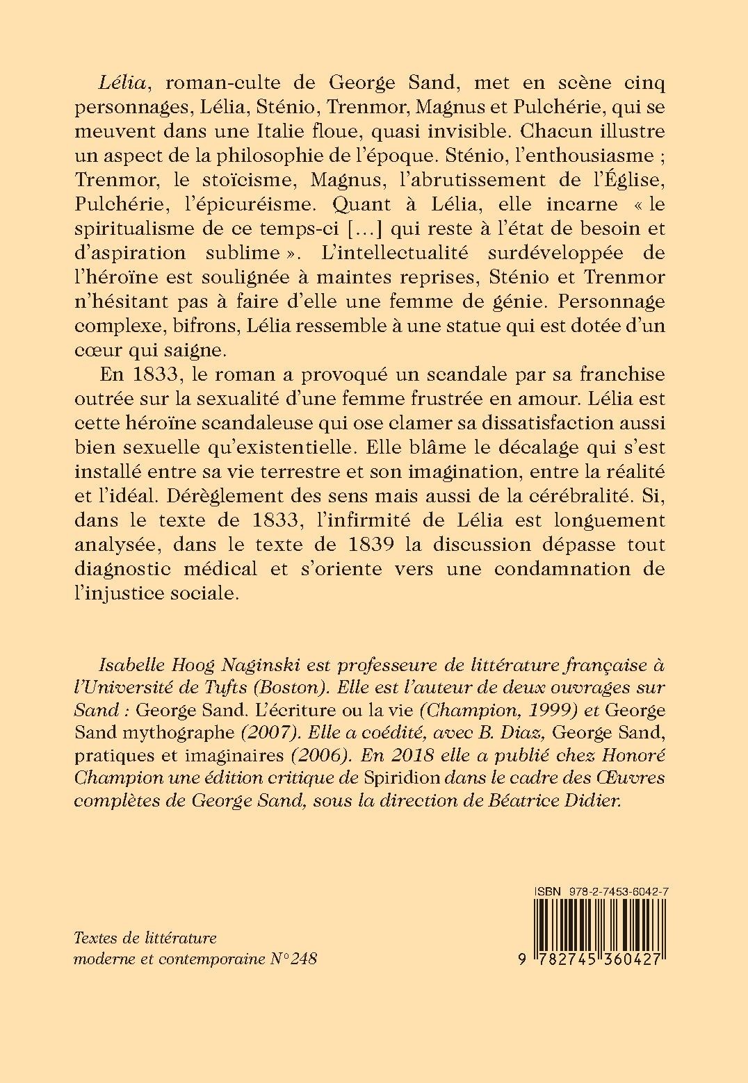 Isabelle Hoog Naginski est professeure de littérature française à l’Université de Tufts (Boston). Elle est l’auteur de deux ouvrages sur Sand : George Sand. L’écriture ou la vie (Champion, 1999) et George Sand mythographe (2007). Elle a coédité, avec B. Diaz, George Sand, pratiques et imaginaires (2006). En 2018 elle a publié chez Honoré Champion une édition critique de Spiridion dans le cadre des Œuvres complètes de George Sand, sous la direction de Béatrice Didier.