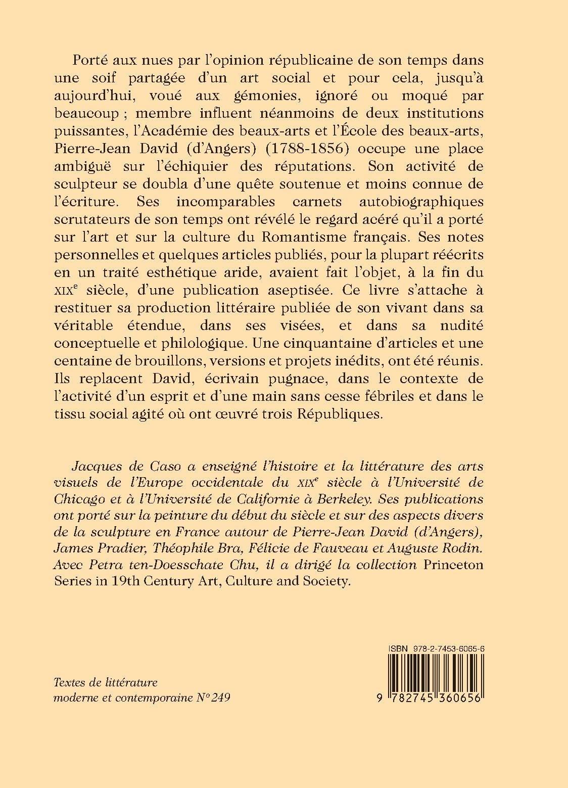 Porté aux nues par l’opinion républicaine de son temps dans une soif partagée d’un art social et pour cela, jusqu’à aujourd’hui, voué aux gémonies, ignoré ou moqué par beaucoup ; membre influent néanmoins de deux institutions puissantes, l’Académie des beaux-arts et l’École des beaux-arts, Pierre-Jean David (d’Angers) (1788-1856) occupe une place ambiguë sur l’échiquier des réputations. Son activité de sculpteur se doubla d’une quête soutenue et moins connue de l’écriture. Ses incomparables carnets autobiographiques scrutateurs de son temps ont révélé le regard acéré qu’il a porté sur l’art et sur la culture du Romantisme français. Ses notes personnelles et quelques articles publiés, pour la plupart réécrits en un traité esthétique aride, avaient fait l’objet, à la fin du XIXe siècle, d’une publication aseptisée. Ce livre s’attache à restituer sa production littéraire publiée de son vivant dans sa véritable étendue, dans ses visées, et dans sa nudité conceptuelle et philologique. Une cinquantaine d’articles et une centaine de brouillons, versions et projets inédits, ont été réunis. Ils replacent David, écrivain pugnace, dans le contexte de l’activité d’un esprit et d’une main sans cesse fébriles et dans le tissu social agité où ont œuvré trois Républiques.