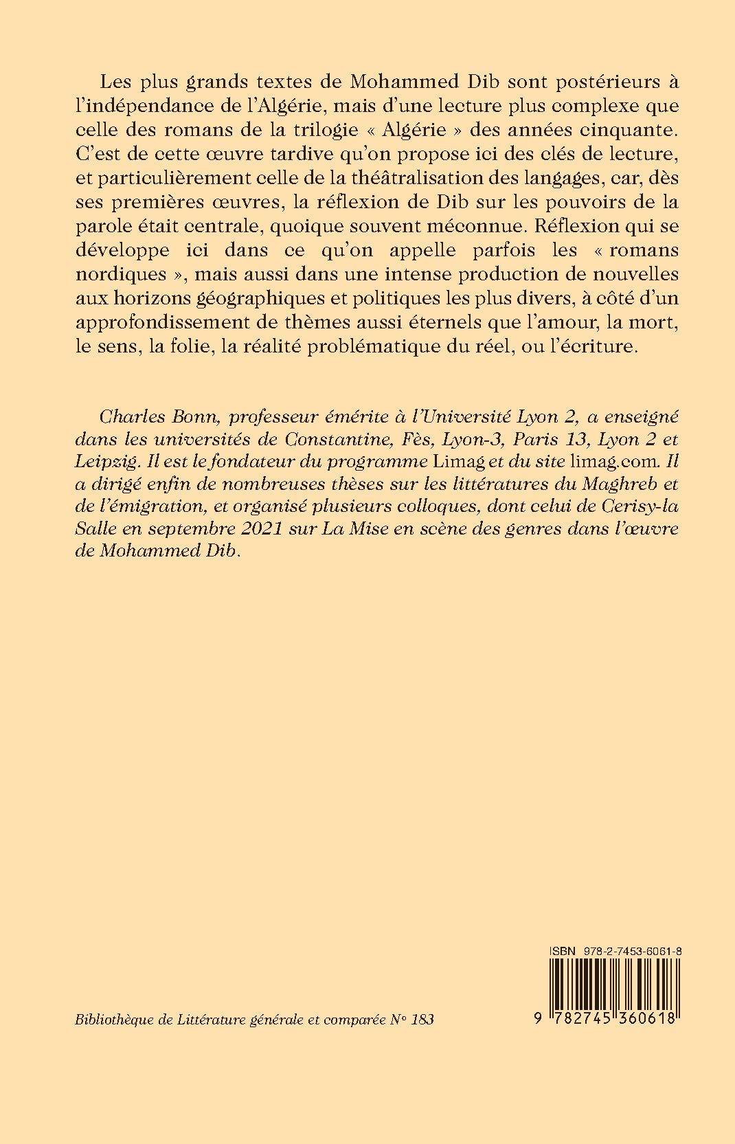 Les plus grands textes de Mohammed Dib sont postérieurs à l’indépendance de l’Algérie, mais d’une lecture plus complexe que celle des romans de la trilogie « Algérie » des années cinquante. C’est de cette œuvre tardive qu’on propose ici des clés de lecture, et particulièrement celle de la théâtralisation des langages, car, dès ses premières œuvres, la réflexion de Dib sur les pouvoirs de la parole était centrale, quoique souvent méconnue. Réflexion qui se développe ici dans ce qu’on appelle parfois les « romans nordiques », mais aussi dans une intense production de nouvelles aux horizons géographiques et politiques les plus divers, à côté d’un approfondissement de thèmes aussi éternels que l’amour, la mort, le sens, la folie, la réalité problématique du réel, ou l’écriture.