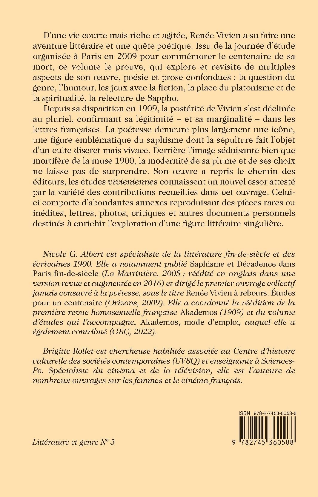 Depuis sa disparition en 1909, la postérité de Vivien s’est déclinée au pluriel, confirmant sa légitimité – et sa marginalité – dans les lettres françaises. La poétesse demeure plus largement une icône, une figure emblématique du saphisme dont la sépulture fait l’objet d’un culte discret mais vivace. Derrière l’image séduisante bien que mortifère de la muse 1900, la modernité de sa plume et de ses choix ne laisse pas de surprendre. Son œuvre a repris le chemin des éditeurs, les études vivieniennes connaissent un nouvel essor attesté par la variété des contributions recueillies dans cet ouvrage. Celui-ci comporte d’abondantes annexes reproduisant des pièces rares ou inédites, lettres, photos, critiques et autres documents personnels destinés à enrichir l’exploration d’une figure littéraire singulière.