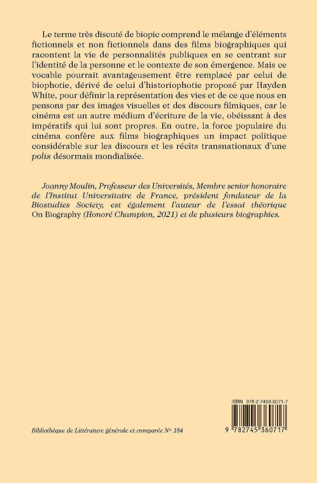 Le terme très discuté de biopic comprend le mélange d’éléments fictionnels et non fictionnels dans des films biographiques qui racontent la vie de personnalités publiques en se centrant sur l’identité de la personne et le contexte de son émergence. Mais ce vocable pourrait avantageusement être remplacé par celui de biophotie, dérivé de celui d’historiophotie proposé par Hayden White, pour définir la représentation des vies et de ce que nous en pensons par des images visuelles et des discours filmiques, car le cinéma est un autre médium d’écriture de la vie, obéissant à des impératifs qui lui sont propres. En outre, la force populaire du cinéma confère aux films biographiques un impact politique considérable sur les discours et les récits transnationaux d’une polis désormais mondialisée.