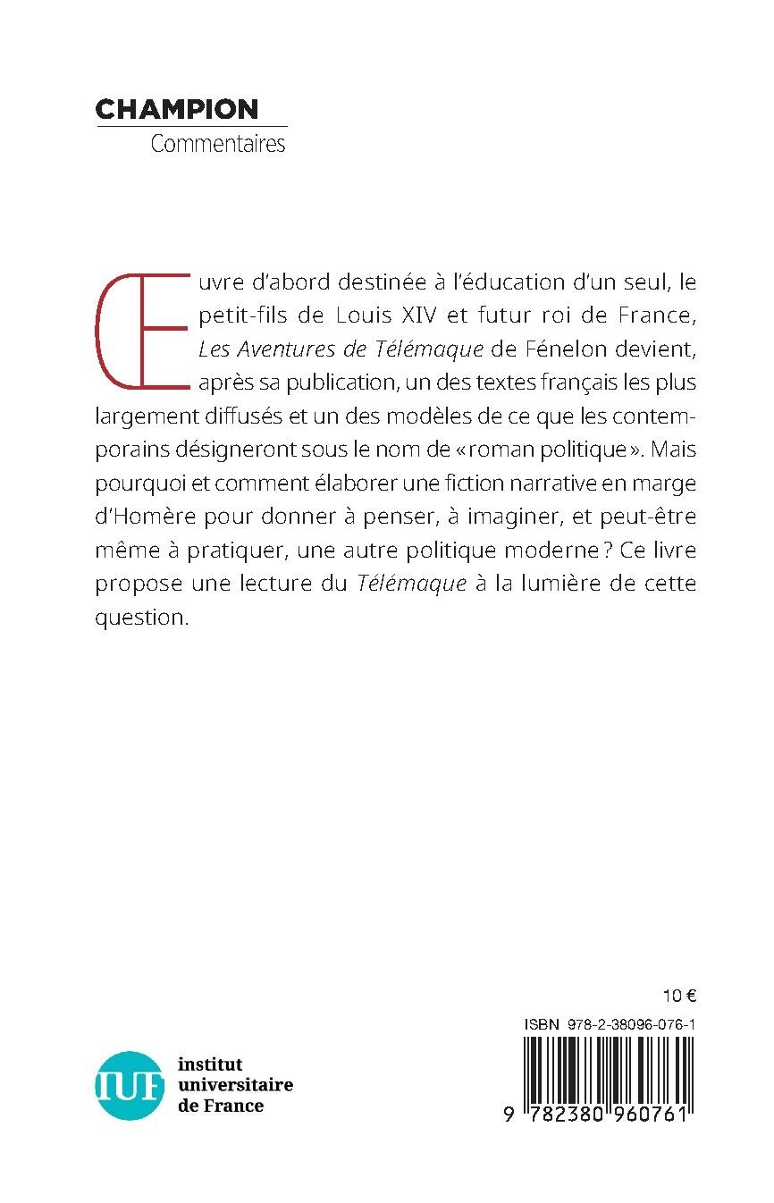 Œuvre d’abord destinée à l’éducation d’un seul, le petit-fils de Louis XIV et futur roi de France, Les Aventures de Télémaque de Fénelon devient, après sa publication, un des textes français les plus largement diffusés et un des modèles de ce que les contemporains désigneront sous le nom de « roman politique ». Mais pourquoi et comment élaborer une fiction narrative en marge d’Homère pour donner à penser, à imaginer, et peut-être même à pratiquer, une autre politique moderne ? Ce livre propose une lecture du Télémaque à la lumière de cette question.