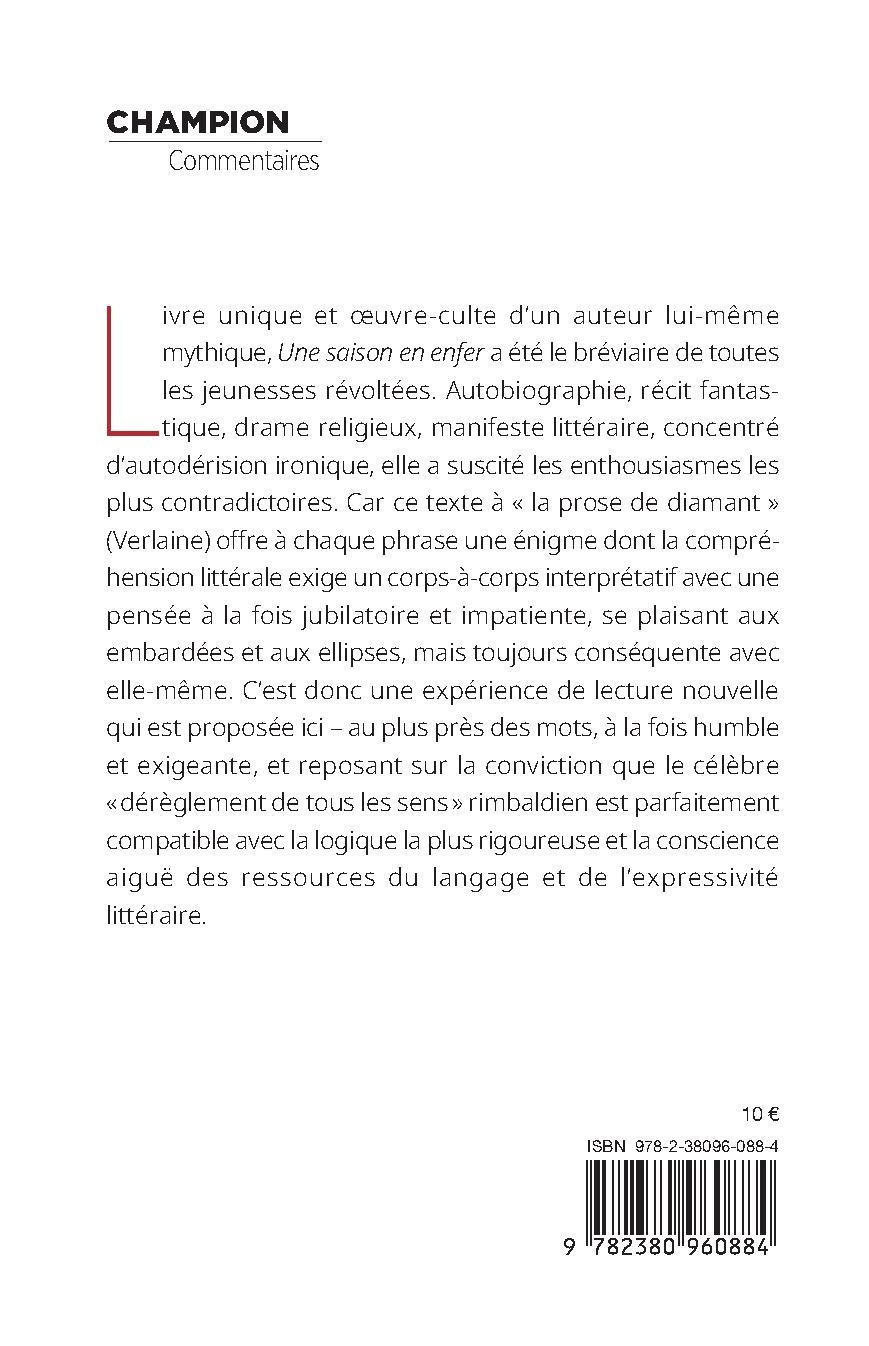 Livre unique et œuvre-culte d’un auteur lui-même mythique, Une saison en enfer a été le bréviaire de toutes les jeunesses révoltées. Autobiographie, récit fantastique, drame religieux, manifeste littéraire, concentré d’autodérision ironique, elle a suscité les enthousiasmes les plus contradictoires. Car ce texte à « la prose de diamant » (Verlaine) offre à chaque phrase une énigme dont la compréhension littérale exige un corps-à-corps interprétatif avec une pensée à la fois jubilatoire et impatiente, se plaisant aux embardées et aux ellipses, mais toujours conséquente avec elle-même. C’est donc une expérience de lecture nouvelle qui est proposée ici – au plus près des mots, à la fois humble et exigeante, et reposant sur la conviction que le célèbre « dérèglement de tous les sens » rimbaldien est parfaitement compatible avec la logique la plus rigoureuse et la conscience aiguë des ressources du langage et de l’expressivité littéraire.