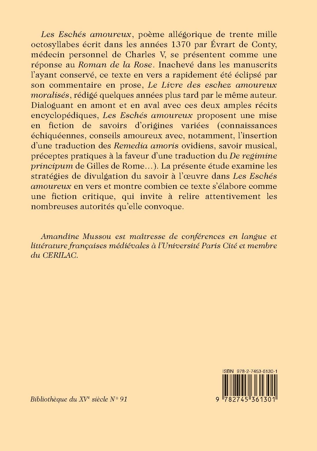 Les Eschés amoureux, poème allégorique de trente mille octosyllabes écrit dans les années 1370 par Évrart de Conty, médecin personnel de Charles V, se présentent comme une réponse au Roman de la Rose. Inachevé dans les manuscrits l’ayant conservé, ce texte en vers a rapidement été éclipsé par son commentaire en prose, Le Livre des eschez amoureux moralisés, rédigé quelques années plus tard par le même auteur. Dialoguant en amont et en aval avec ces deux amples récits encyclopédiques, Les Eschés amoureux proposent une mise en fiction de savoirs d’origines variées (connaissances échiquéennes, conseils amoureux avec, notamment, l’insertion d’une traduction des Remedia amoris ovidiens, savoir musical, préceptes pratiques à la faveur d’une traduction du De regimine principum de Gilles de Rome…). La présente étude examine les stratégies de divulgation du savoir à l’œuvre dans Les Eschés amoureux en vers et montre combien ce texte s’élabore comme une fiction critique, qui invite à relire attentivement les nombreuses autorités qu’elle convoque.