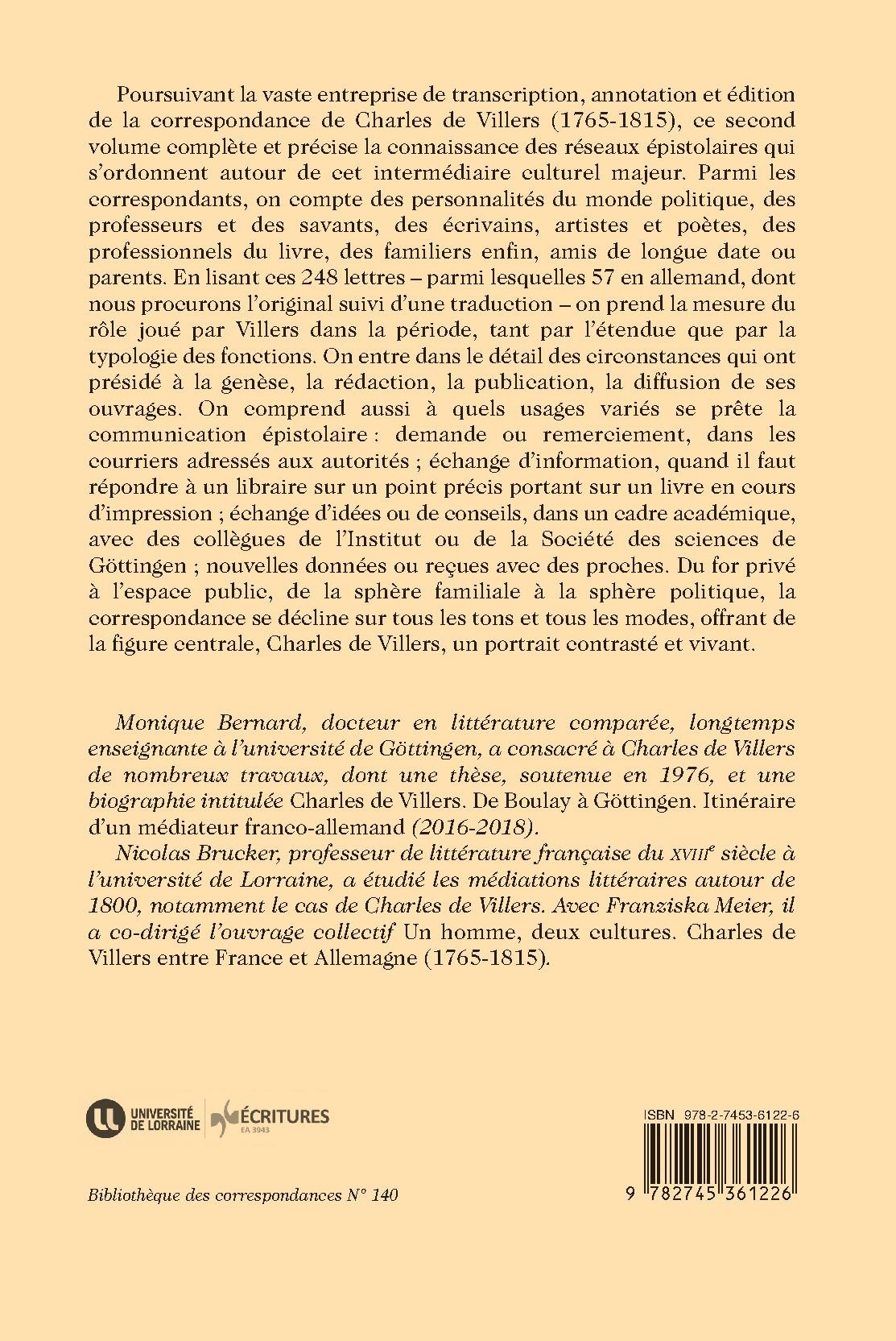 Poursuivant la vaste entreprise de transcription, annotation et édition de la correspondance de Charles de Villers (1765-1815), ce second volume complète et précise la connaissance des réseaux épistolaires qui s’ordonnent autour de cet intermédiaire culturel majeur. Parmi les correspondants, on compte des personnalités du monde politique, des professeurs et des savants, des écrivains, artistes et poètes, des professionnels du livre, des familiers enfin, amis de longue date ou parents. En lisant ces 248 lettres – parmi lesquelles 57 en allemand, dont nous procurons l’original suivi d’une traduction – on prend la mesure du rôle joué par Villers dans la période, tant par l’étendue que par la typologie des fonctions. On entre dans le détail des circonstances qui ont présidé à la genèse, la rédaction, la publication, la diffusion de ses ouvrages. On comprend aussi à quels usages variés se prête la communication épistolaire : demande ou remerciement, dans les courriers adressés aux autorités ; échange d’information, quand il faut répondre à un libraire sur un point précis portant sur un livre en cours d’impression ; échange d’idées ou de conseils, dans un cadre académique, avec des collègues de l’Institut ou de la Société des sciences de Göttingen ; nouvelles données ou reçues avec des proches. Du for privé à l’espace public, de la sphère familiale à la sphère politique, la correspondance se décline sur tous les tons et tous les modes, offrant de la figure centrale, Charles de Villers, un portrait contrasté et vivant.