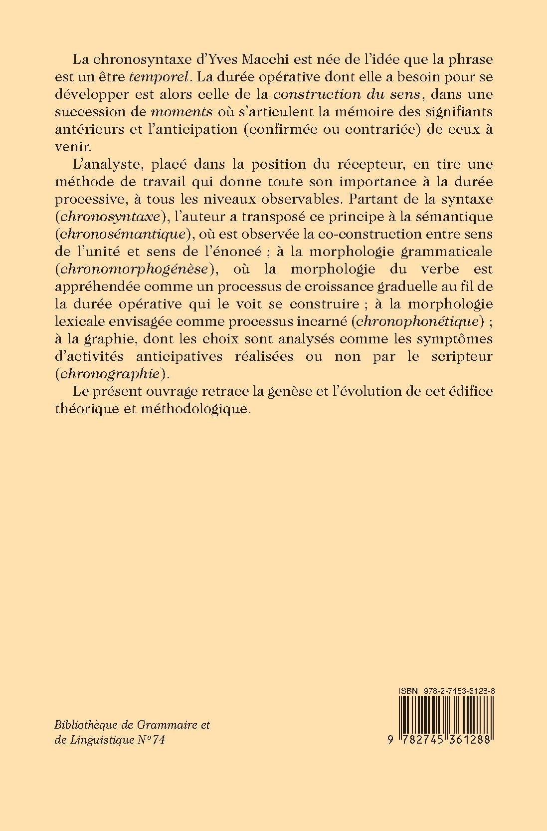 La chronosyntaxe d’Yves Macchi est née de l’idée que la phrase est un être temporel. La durée opérative dont elle a besoin pour se développer est alors celle de la construction du sens, dans une succession de moments où s’articulent la mémoire des signifiants antérieurs et l’anticipation (confirmée ou contrariée) de ceux à venir.