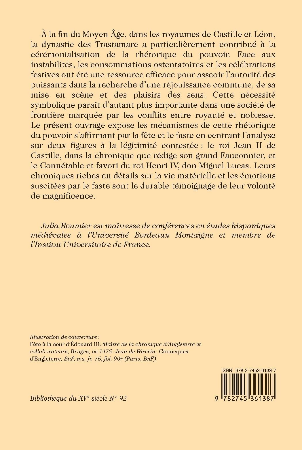 À la fin du Moyen Âge, dans les royaumes de Castille et Léon, la dynastie des Trastamare a particulièrement contribué à la cérémonialisation de la rhétorique du pouvoir. Face aux instabilités, les consommations ostentatoires et les célébrations festives ont été une ressource efficace pour asseoir l’autorité des puissants dans la recherche d’une réjouissance commune, de sa mise en scène et des plaisirs des sens. Cette nécessité symbolique paraît d’autant plus importante dans une société de frontière marquée par les conflits entre royauté et noblesse. Le présent ouvrage expose les mécanismes de cette rhétorique du pouvoir s’affirmant par la fête et le faste en centrant l’analyse sur deux figures à la légitimité contestée : le roi Jean II de Castille, dans la chronique que rédige son grand Fauconnier, et le Connétable et favori du roi Henri IV, don Miguel Lucas. Leurs chroniques riches en détails sur la vie matérielle et les émotions suscitées par le faste sont le durable témoignage de leur volonté de magnificence.