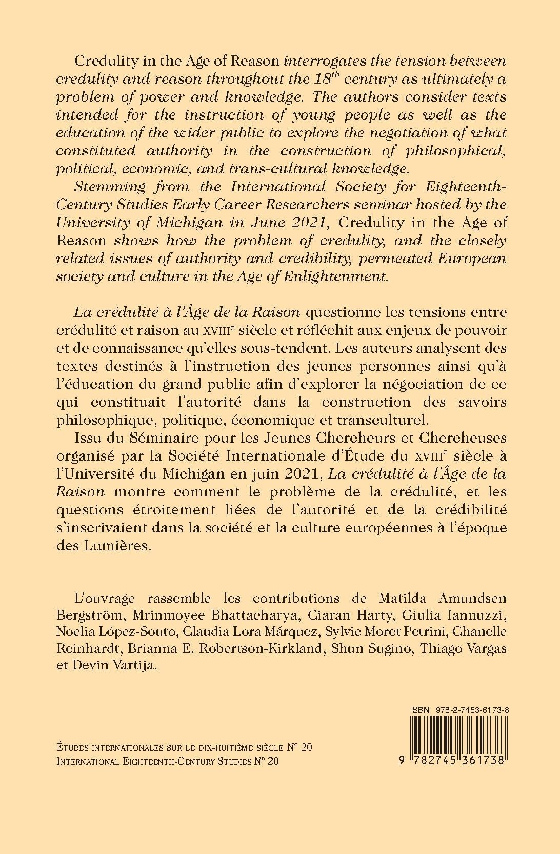 Issu du Séminaire pour les Jeunes Chercheurs et Chercheuses organisé par la Société Internationale d’Étude du XVIIIe siècle à l’Université du Michigan en juin 2021, La crédulité à l’Âge de la Raison montre comment le problème de la crédulité, et les questions étroitement liées de l’autorité et de la crédibilité s’inscrivaient dans la société et la culture européennes à l’époque des Lumières.
