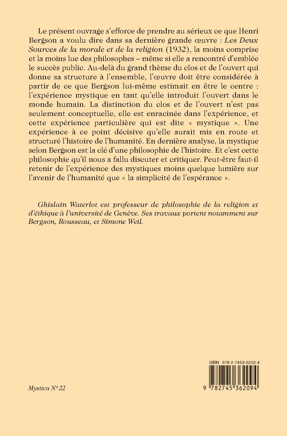 Le présent ouvrage s’efforce de prendre au sérieux ce que Henri Bergson a voulu dire dans sa dernière grande œuvre : Les Deux Sources de la morale et de la religion (1932), la moins comprise et la moins lue des philosophes – même si elle a rencontré d’emblée le succès public. Au-delà du grand thème du clos et de l’ouvert qui donne sa structure à l’ensemble, l’œuvre doit être considérée à partir de ce que Bergson lui-même estimait en être le centre : l’expérience mystique en tant qu’elle introduit l’ouvert dans le monde humain. La distinction du clos et de l’ouvert n’est pas seulement conceptuelle, elle est enracinée dans l’expérience, et cette expérience particulière qui est dite « mystique ». Une expérience à ce point décisive qu’elle aurait mis en route et structuré l’histoire de l’humanité. En dernière analyse, la mystique selon Bergson est la clé d’une philosophie de l’histoire. Et c’est cette philosophie qu’il nous a fallu discuter et critiquer. Peut-être faut-il retenir de l’expérience des mystiques moins quelque lumière sur l’avenir de l’humanité que « la simplicité de l’espérance ».