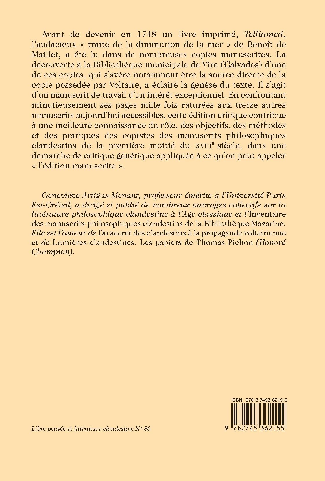 Avant de devenir en 1748 un livre imprimé, Telliamed, l’audacieux « traité de la diminution de la mer » de Benoît de Maillet, a été lu dans de nombreuses copies manuscrites. La découverte à la Bibliothèque municipale de Vire (Calvados) d’une de ces copies, qui s’avère notamment être la source directe de la copie possédée par Voltaire, a éclairé la genèse du texte. Il s’agit d’un manuscrit de travail d’un intérêt exceptionnel. En confrontant minutieusement ses pages mille fois raturées aux treize autres manuscrits aujourd’hui accessibles, cette édition critique contribue à une meilleure connaissance du rôle, des objectifs, des méthodes et des pratiques des copistes des manuscrits philosophiques clandestins de la première moitié du XVIIIe siècle, dans une démarche de critique génétique appliquée à ce qu’on peut appeler « l’édition manuscrite ».